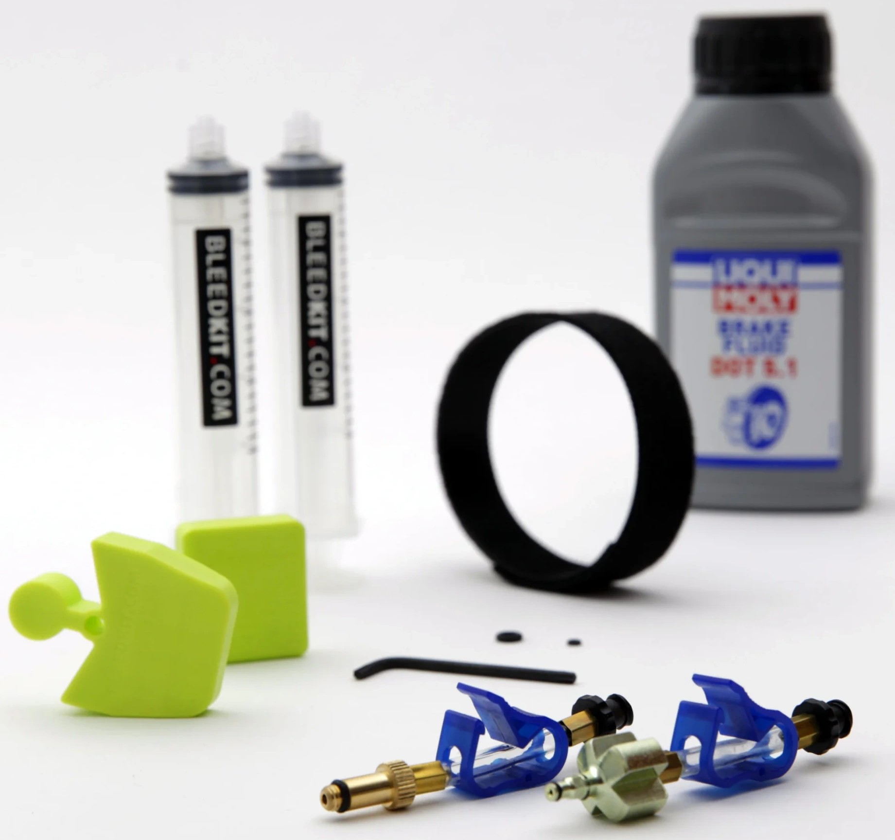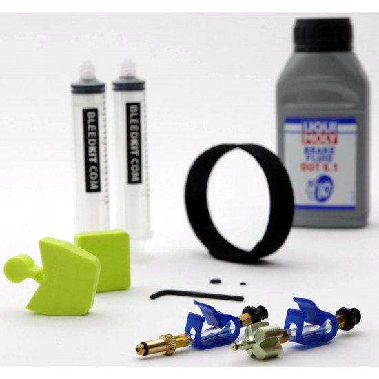 - Includes: Liqui Moly DOT 5.1 fluid 250 ml, 2x 20 ml Becton and Dickinson syringes, 1x M5 assembly, 1x Edge assembly, Spare O-rings, Bleed block for older type SRAM hydraulic brakes (2 or 4 piston type), Bleed block for latest SRAM hydraulic brakes, Torx T10 wrench, Double-sided Velcro strap 25 cm, Nitrile gloves (size L)