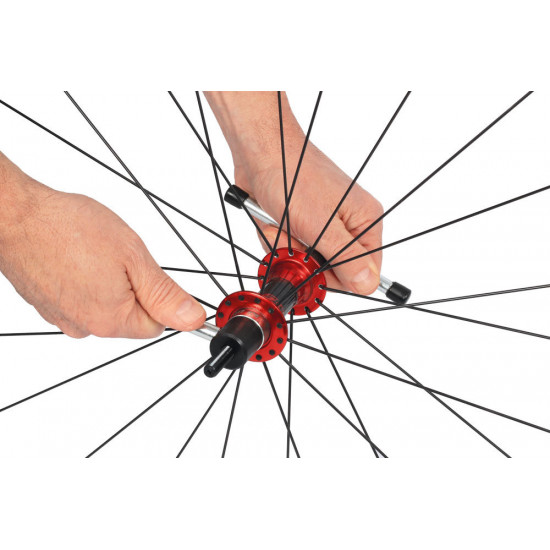This tool set allows to press ball bearings in their seat, e.g. in the frame or hub. The advantage of this tool is the fine threaded spindle applies a gradual and even pressing force on the bearing, thus seating it slowly, which pevents damage to the bearing itself or the bearing housing.