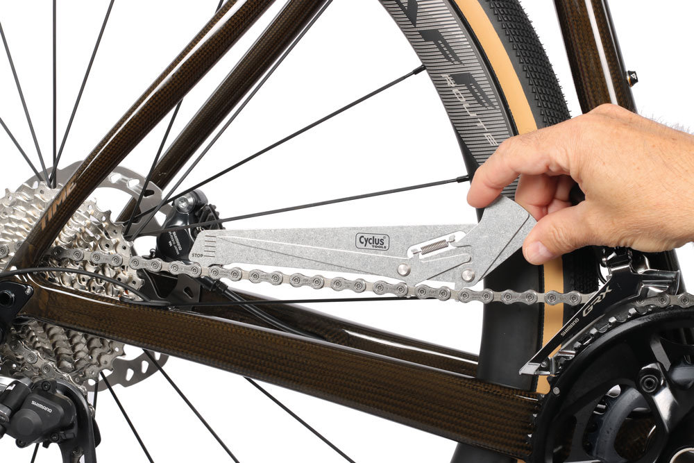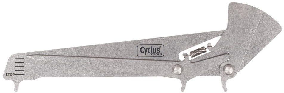 The CYCLUS TOOLS chain wear checker quickly and reliably determines the right time to replace a chain. If a worn chain is not replaced with a new one in good time, shifting performance will deteriorate. In addition, sprockets, chainrings and jockywheels wear prematurely and then must also be replaced. The chain wear tester uses two measuring prongs to measure the chain rollers on the inner plates, each on the same left side. This means that the measurement result is independent of the roller size and roller play. All 1/2 inch chains including SRAM AXS can be measured. The third prong applies tension to the chain via a spring. This means that the measuring process is not affected by the force the user's hand applies when inserting the measuring prongs. The degree of wear is then displayed on a simple to read scale. The Stop mark = 1% elongation of the chain.
