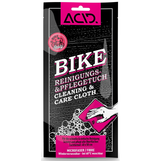 The ACID Bike cleaning and care cloth made from microfibre is ideal for effectively removing light contamination from your bike. This cloth not only ensures thorough cleaning, but also contains special care components that protect all surfaces of the bike from the effects of the weather. The high quality of the product enables reliable and gentle care of your bike under all conditions. In the case of unpainted surfaces and carbon, compatibility with the surface should be tested in advance on an inconspicuous area.