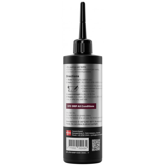 UFO DRIP All Conditions liquid wax chain coating is the ultimate chain lubricant designed for riders seeking speed, efficiency, and durability in all riding conditions. Delivering low friction, long-lasting protection, all while remaining clean, you get the best performance from every ride.