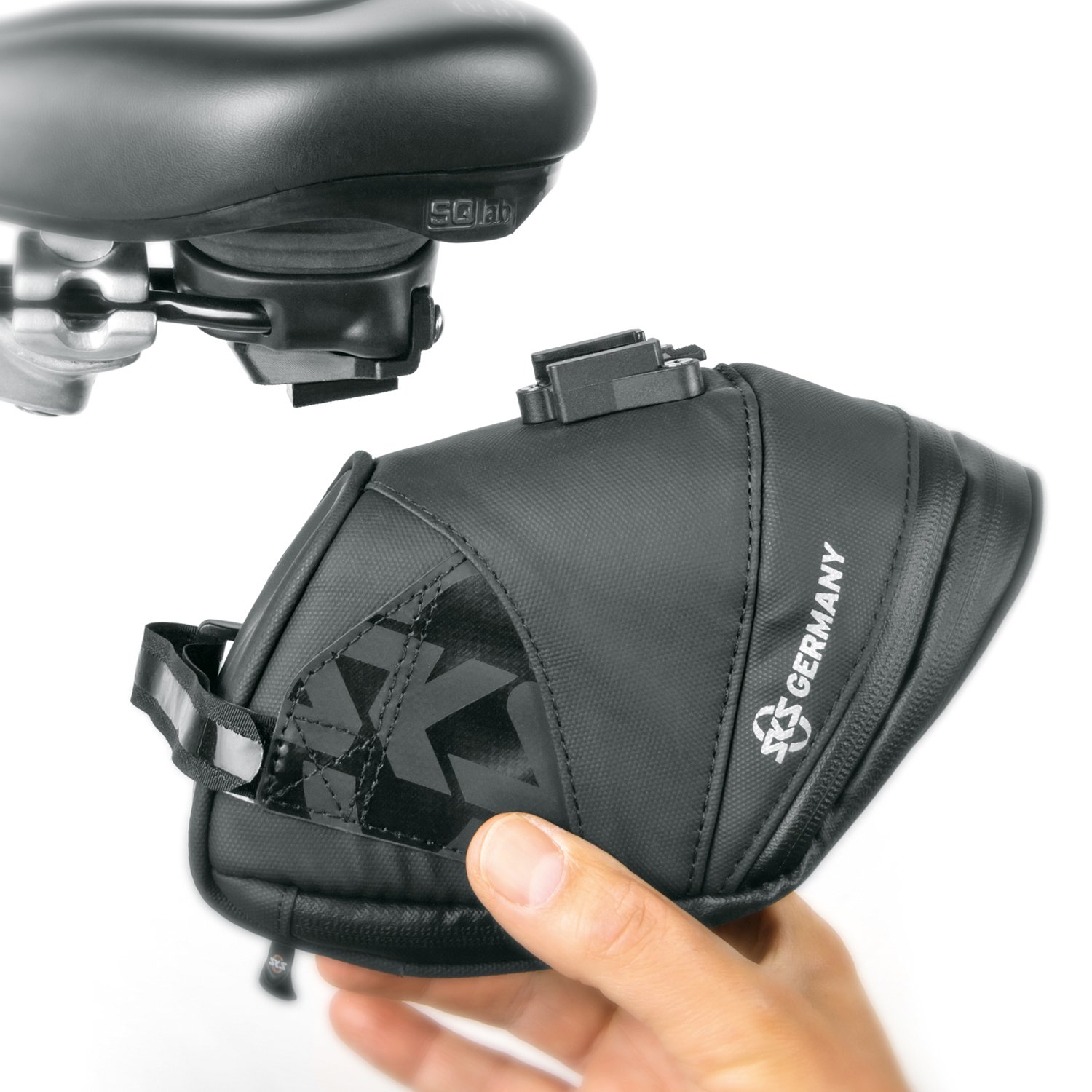 The small lightweight adapter is integrated discreetly under the saddle. Once mounted with two screws, the bag can be easily pushed onto the adapter. The saddle bag can be removed by simply pressing the lever.