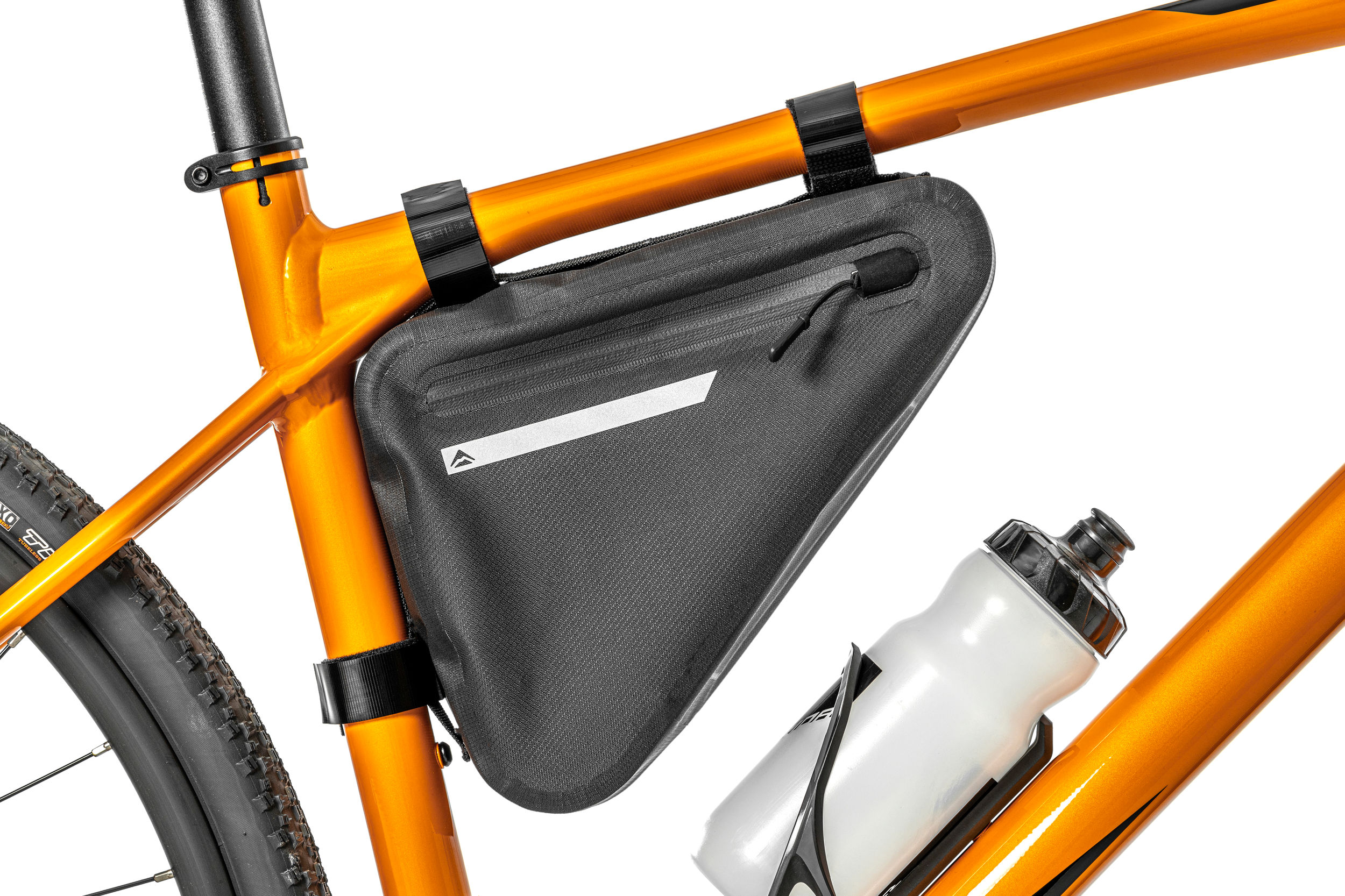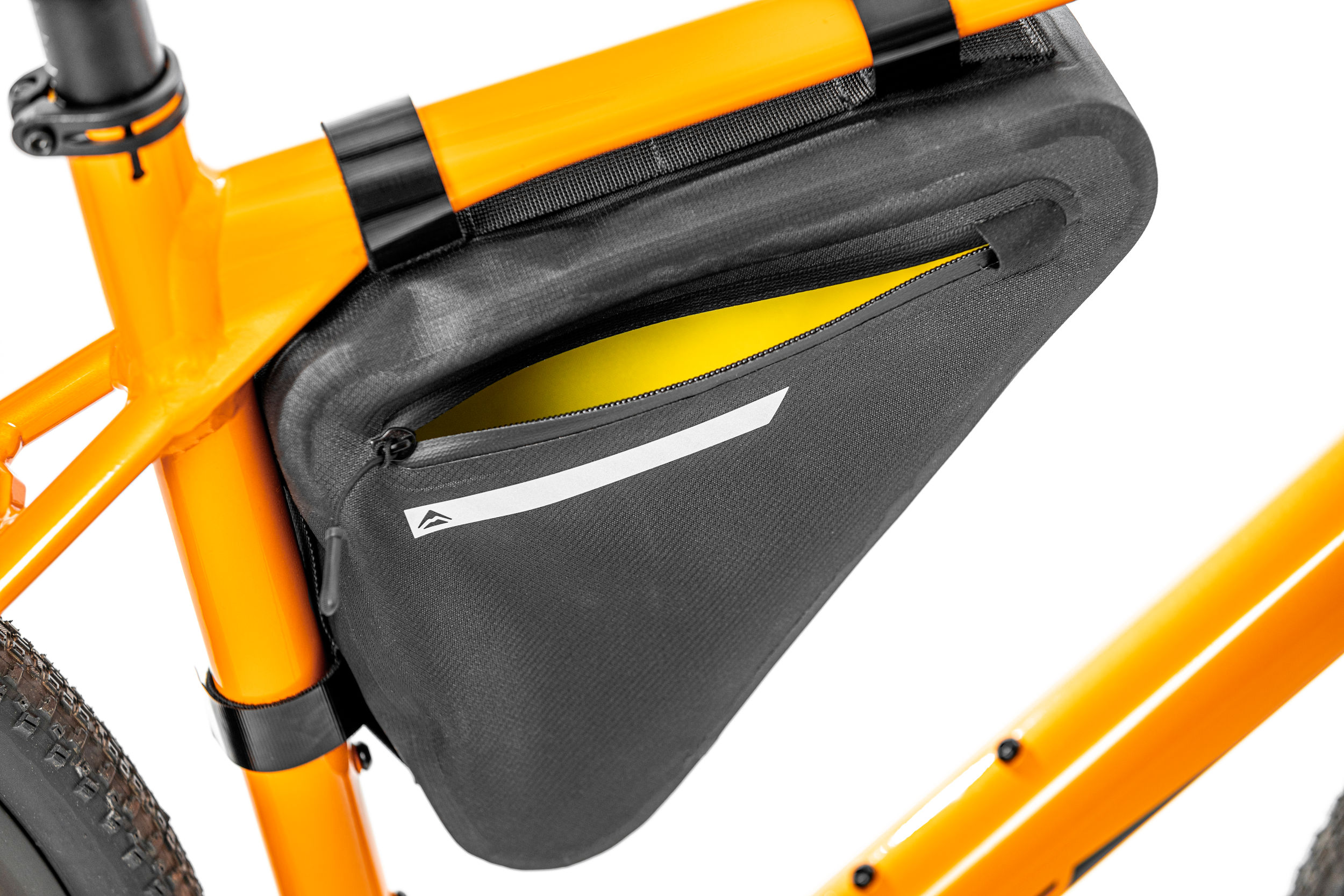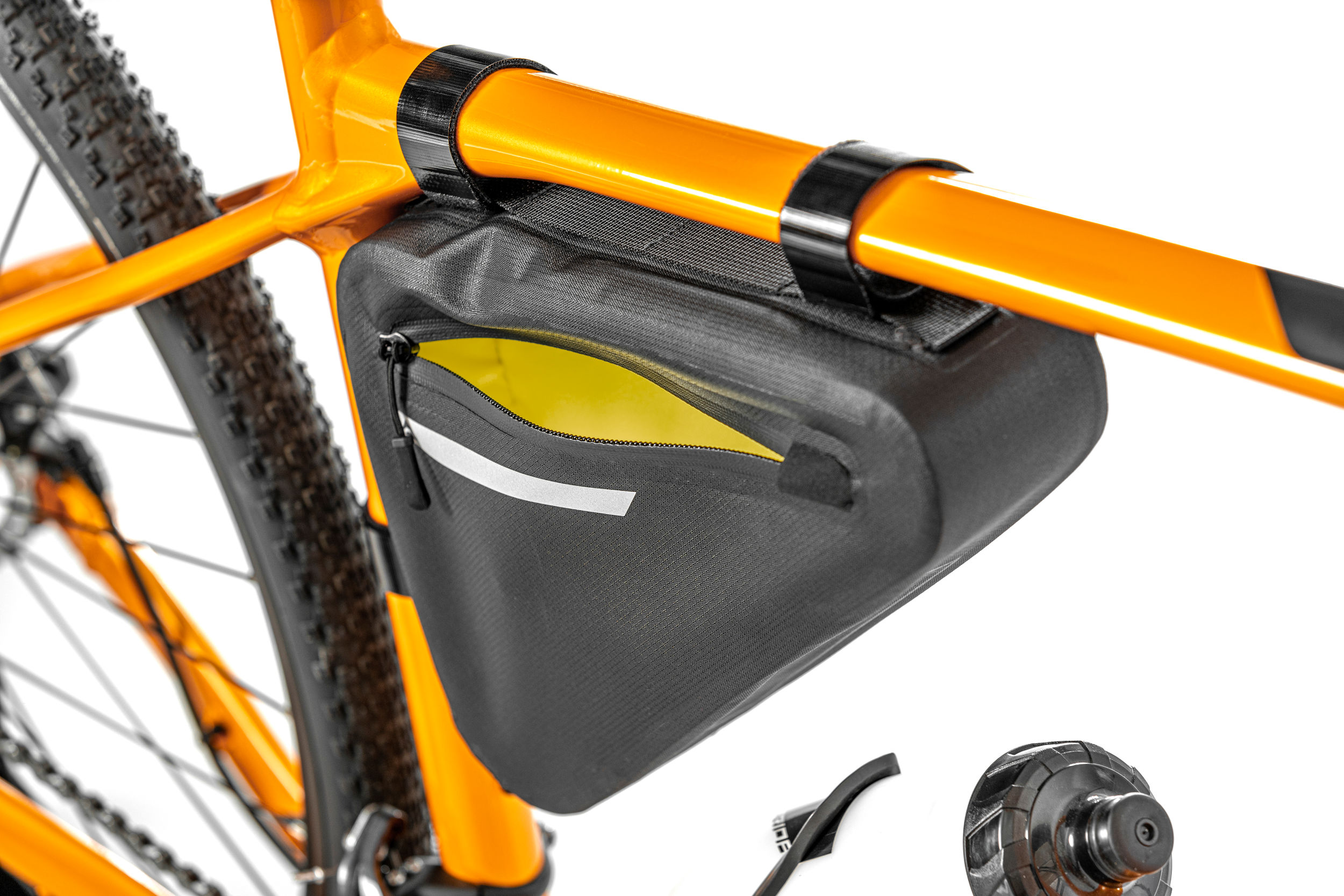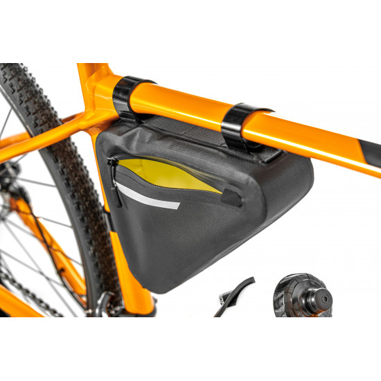 Made from tear and water-resistant Ripstop material, classic triangle frame bag perfectly fits into the top tube - seat tube junction, making access to your ride essentials super easy. The 3 L storage volume gives you ample space for tools, snacks and perhaps even a light raincoat, while the waterproof zip and the reflective printing keep things dry and visibility high. Multiple adjustable hook and loop straps help to fit the bag to pretty much any frame and lock the bog solidly into place.