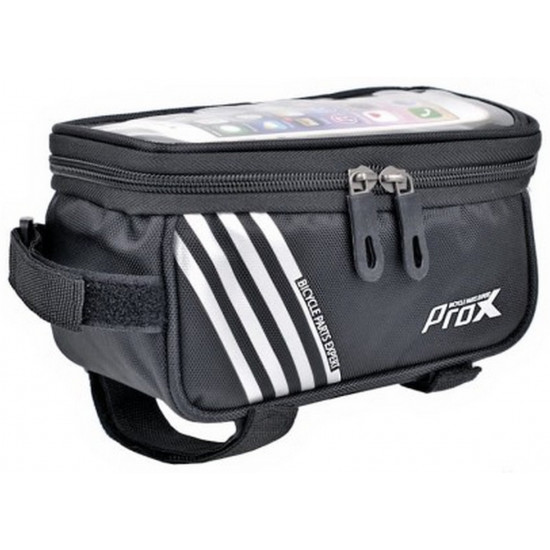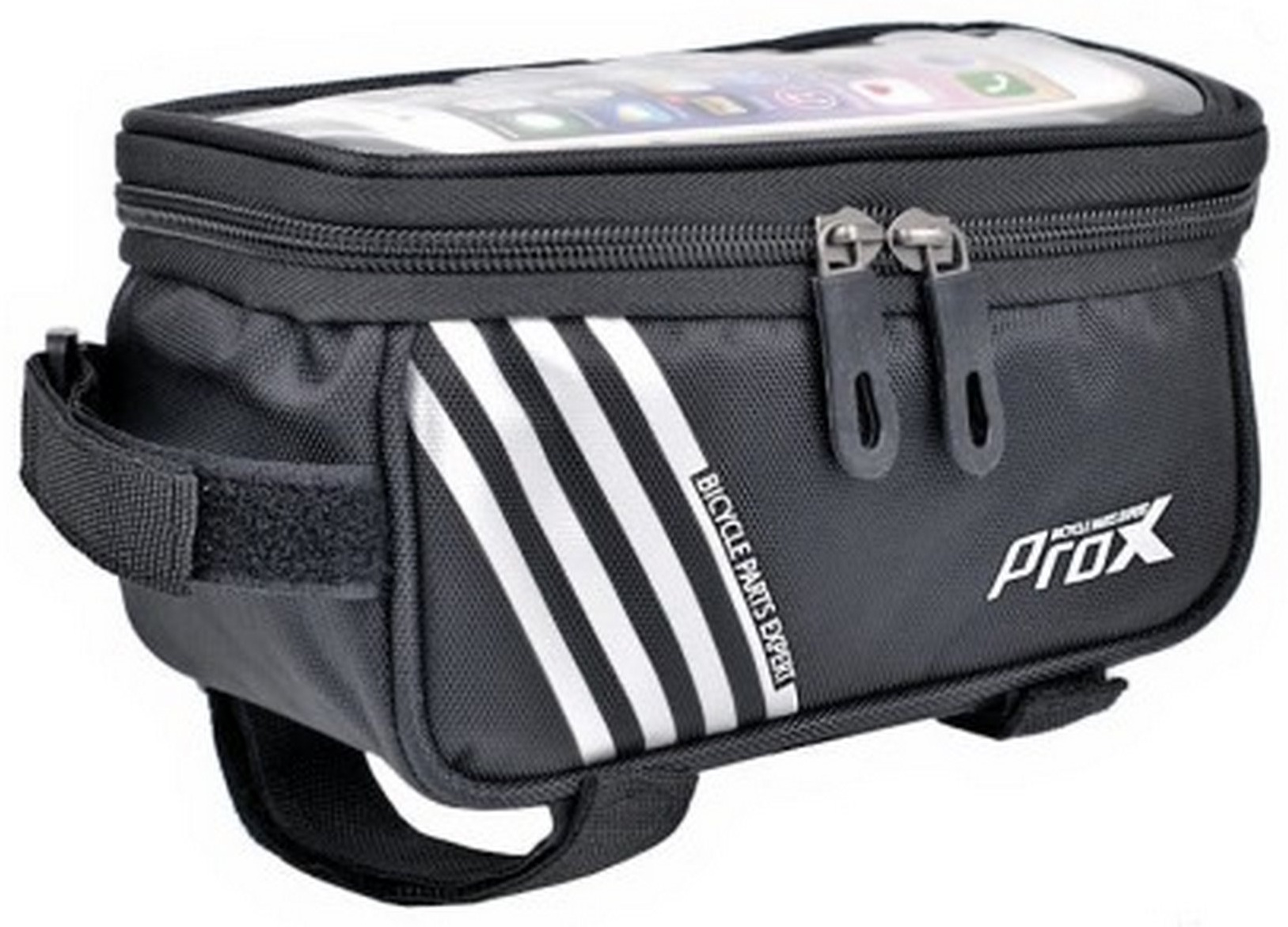 - Frame pannier with phone pocketRoomy zipped compartment with two zippersFor a phone with a screen of up to 5.7 inches3-point attachment with Velcro strapsReinforced bottom and walls of pannier, reflective stripesMesh pocket on one sideMaterial: polyester / PVC meshDimensions: 18 x 9,5 x 8,5 cmWeight: 139gCapacity 1.2l