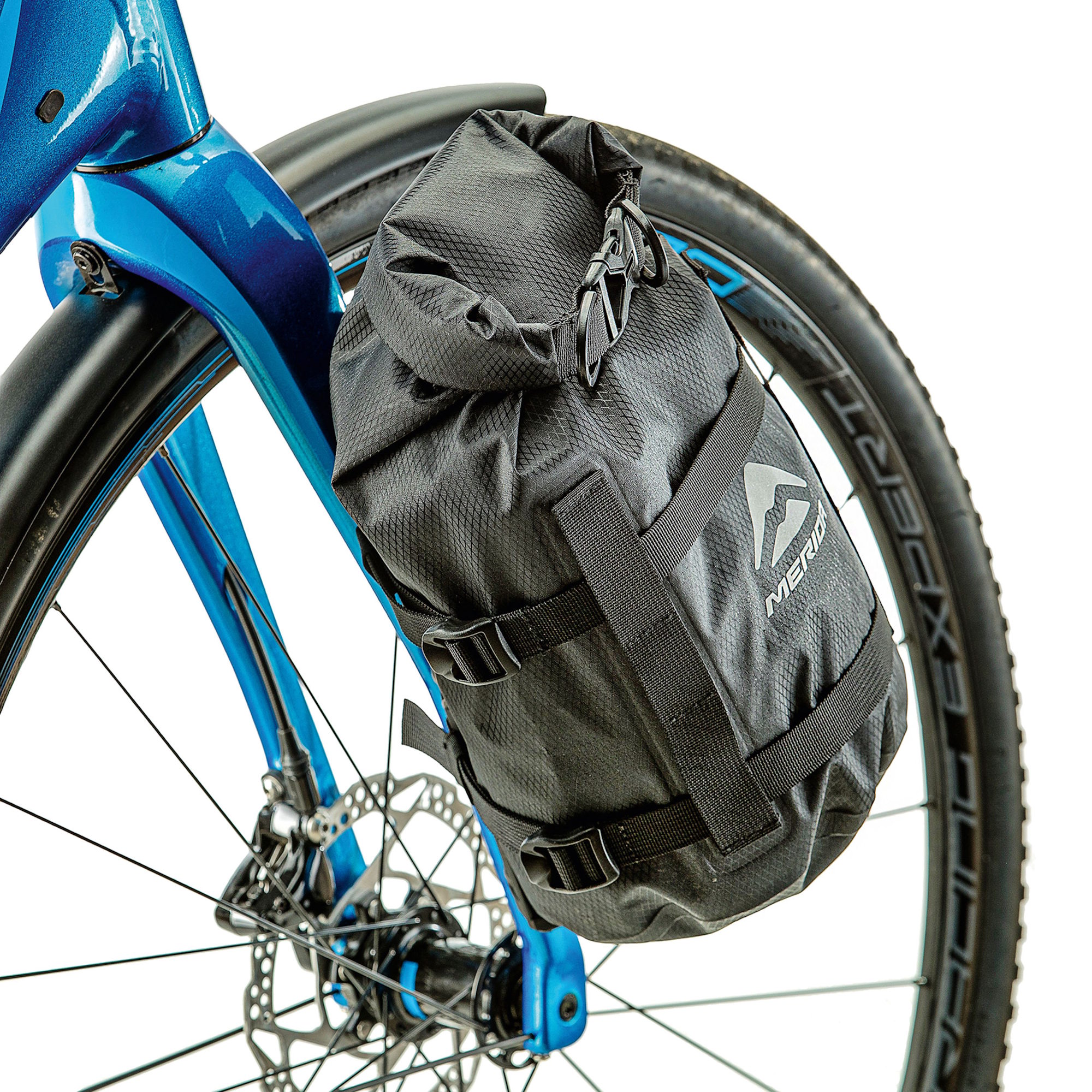 The 'gravel cage' with its water-repellent bag from MERIDA is designed with SILEX in mind but is also suitable for other bikes with threaded bosses on the fork legs. The cage offers a secure storage option for your luggage and/or spare parts. The gravel cage can be quickly and easily mounted onto forks fitted with mounts or with the help of the cable ties supplied if not. The reflective logo provides extra safety.