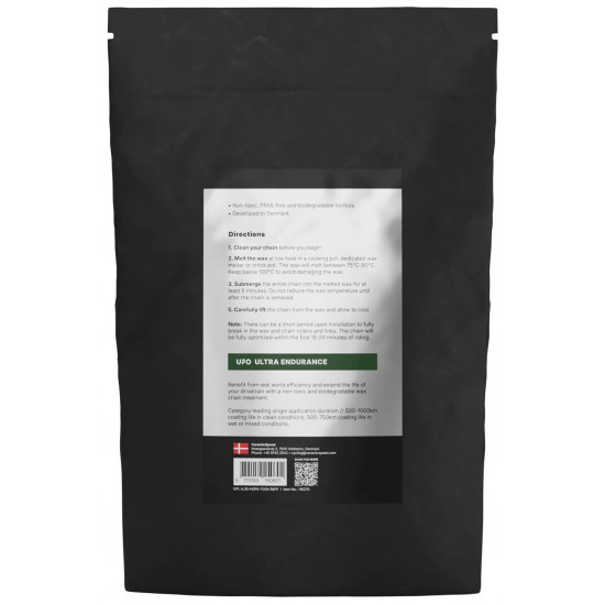 How far can you ride with a single hot wax application? - Ceramicspeed asked itself this question, which led its in-house chemists to develop the UFO Ultra Endurance Wax. It sets completely new standards for extremely long-lasting performance and quiet performance in different weather conditions. Your chain stays clean and perfectly lubricated for longer. Conventional chain oil, on the other hand, tends to attract dirt. In test rides, riders achieved a range of over 1000 km in varying conditions with just one application.
