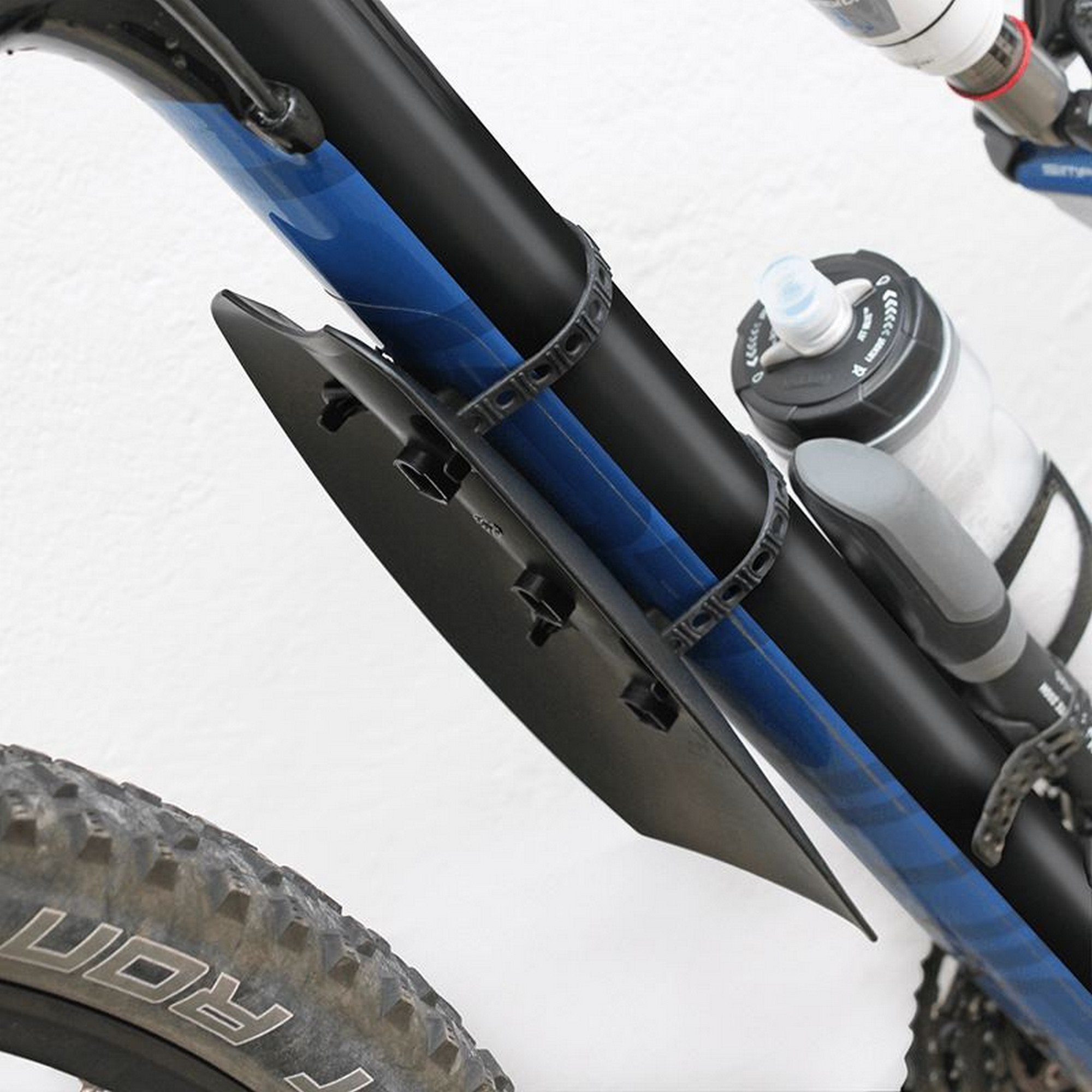 X-board is made from unbreakable high-performance plastic. It can be fastened on almost every downtube profile and size within seconds. The two elastic rubber straps just need to be fixed on the hooks of the dirtboard - ready to go. No fixing parts on the frame are necessary. Can be used with 26"-29" MTB bicycles.
