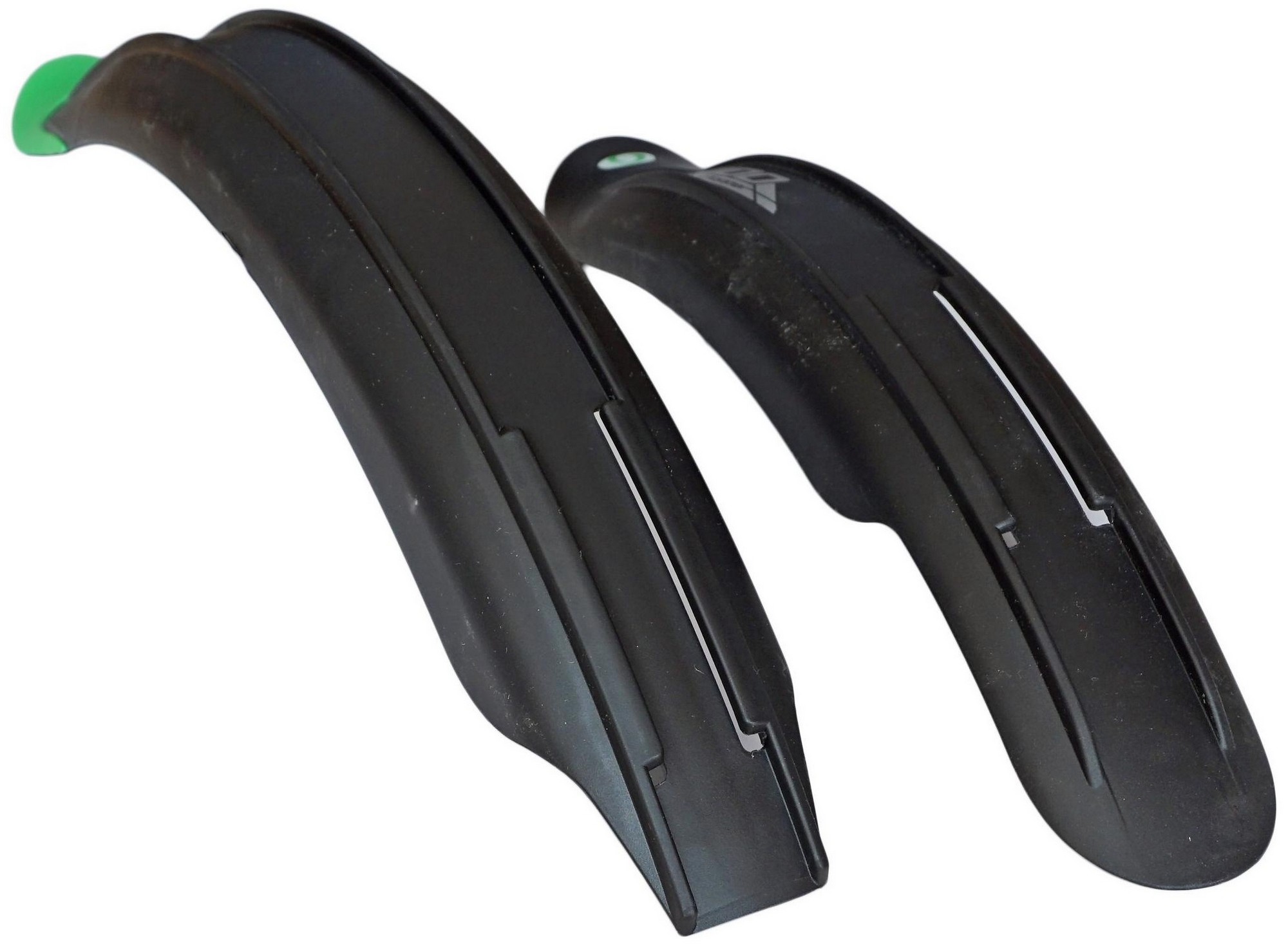 Simpla Kido muguards for children's bicycles are made from quality firm plasticDesigned for 20" wheelsWith rubber mudflap on rear mudguardMudguard has reflective logo "Simpla"With mounting parts - screws and retaining platesWidth: 65 mmWeight: 210 gColor: Black with green mudflap (rear)