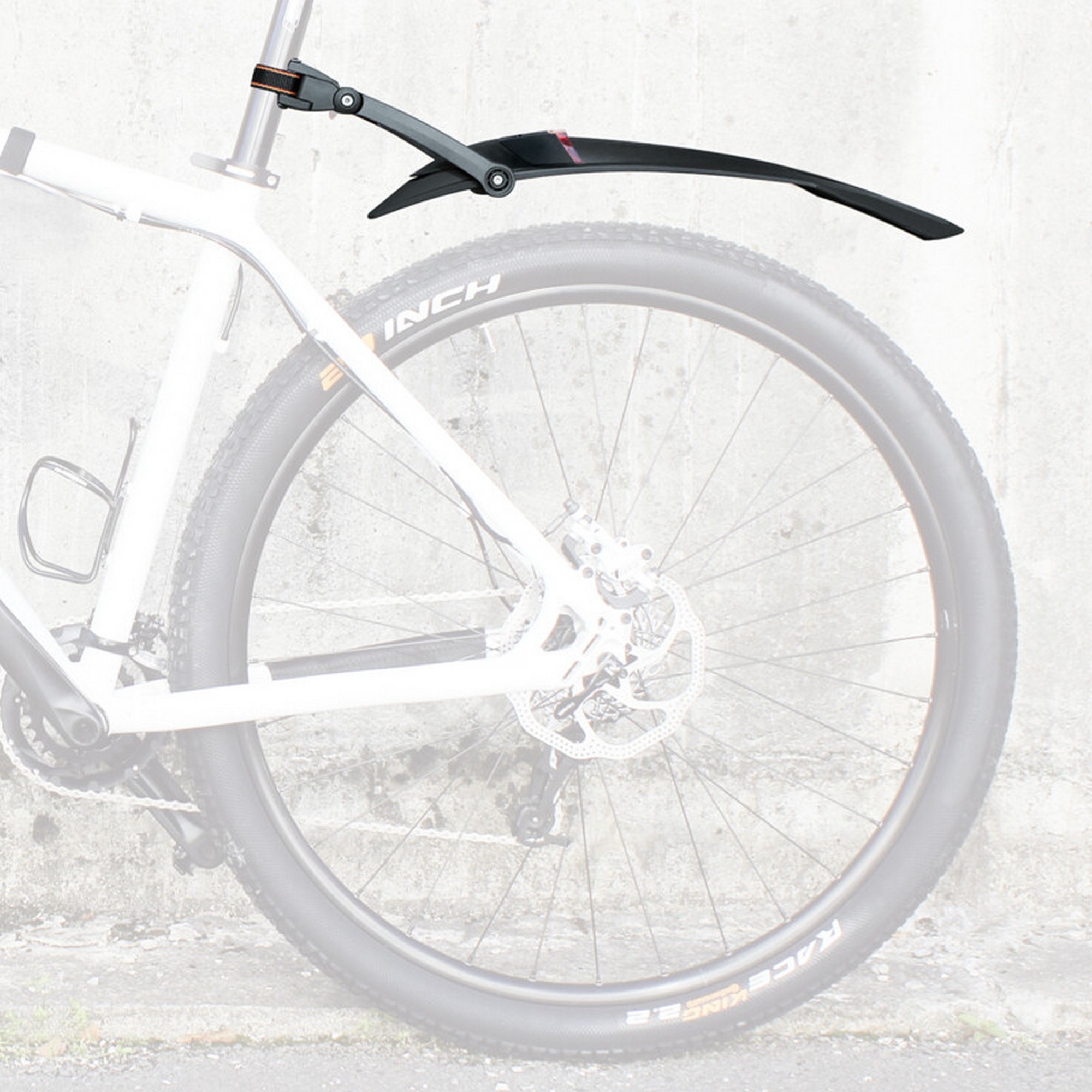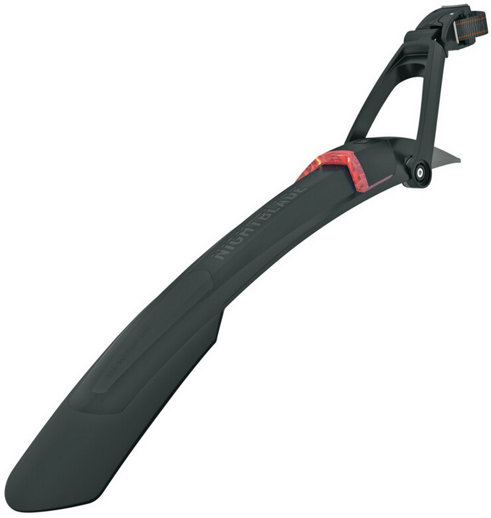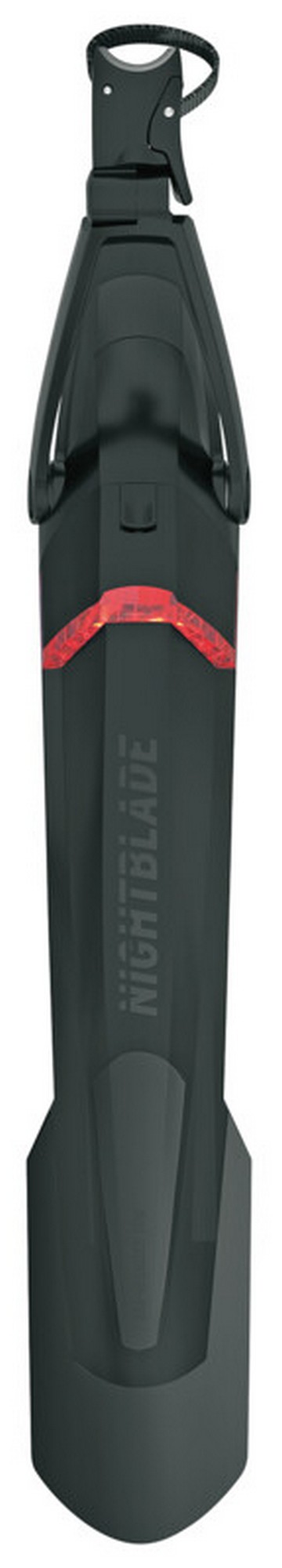 Best protection with high luminosity! The NIGHTBLADE MTB mudguard for the rear wheel is an enlightening example of integrated bicycle solutions. It not only provides optimal splash protection the NIGHTBLADE also ensures greater safety in road traffic from the integrated rear light. The rear light with integrated rechargeable battery can be removed and charged with a USB connection. The rear light with the integrated battery can be removed and can be recharged using a USB connection. The spoilers of softer plastic serve as edge protectors when getting on or off the bike. The simple quick-release mounting system enables the NIGHTBLADE to be mounted on almost all seat posts using powerstraps and the 2-joint technology enables them to be optimally adjusted to mountainbikes.