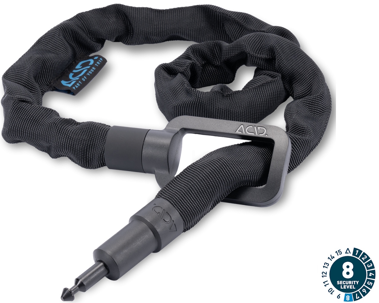 You don't just want to lock your bike with a frame lock, but also connect it somewhere for more security? The solution: the acid plug-in chain for the acid latch 6078 frame lock, allowing you to additionally secure your bike to a fixed object and only need one key. The insert chain is quiet, extremely robust and wear-resistant. The soft plastic cover protects the frame from scratches. The acid pro 100 is 100 cm long, the pro 150 is also available with a length of 150 cm.