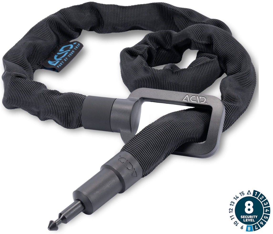 You don't just want to lock your bike with a frame lock, but also connect it somewhere for more security? The solution: the acid plug-in chain for the acid latch 6078 frame lock, allowing you to additionally secure your bike to a fixed object and only need one key. The insert chain is quiet, extremely robust and wear-resistant. The soft plastic cover protects the frame from scratches. The acid pro 100 is 100 cm long, the pro 150 is also available with a length of 150 cm.