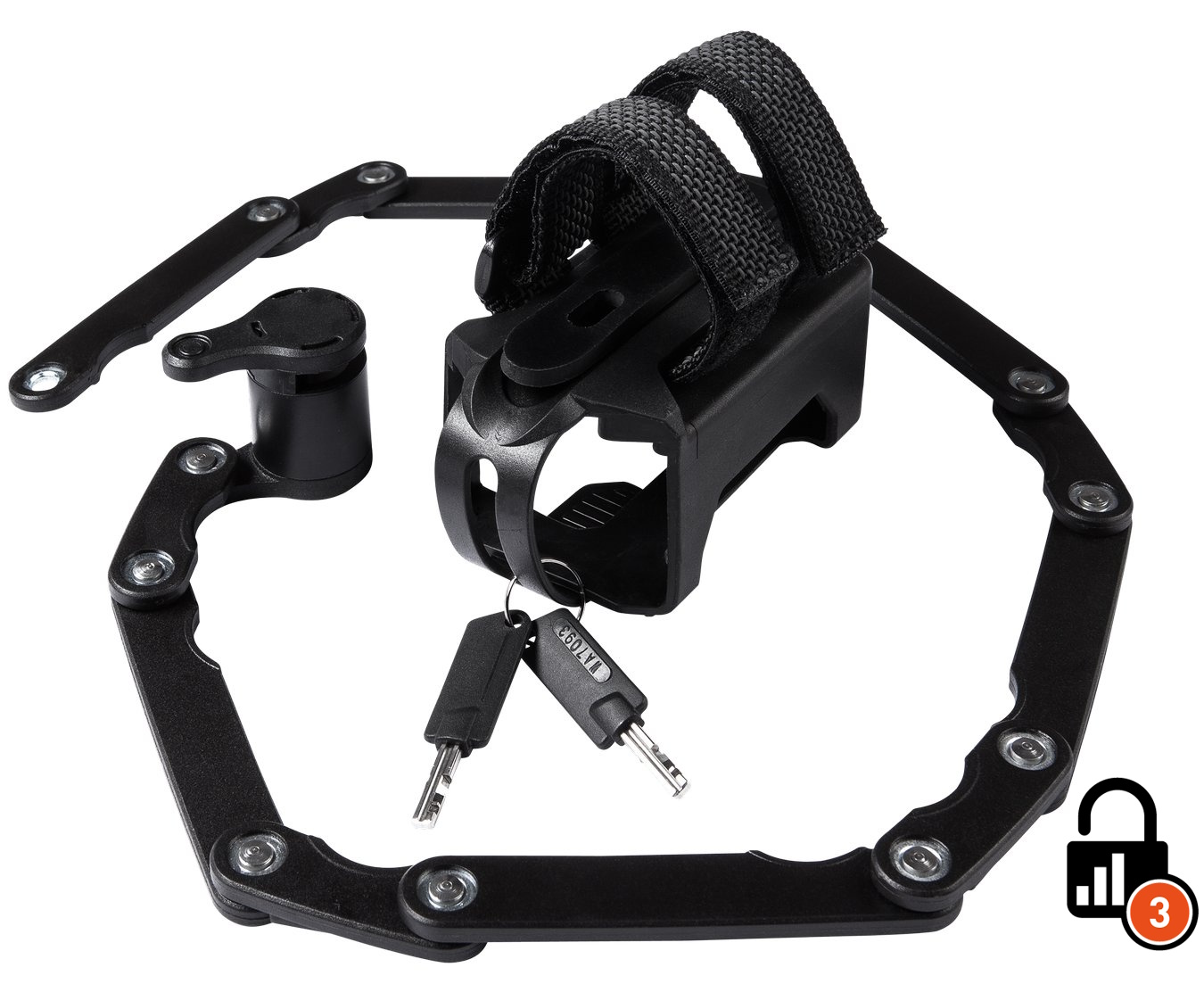 High security meets convenience in this 800 mm folding lock with a particularly handy small pack size. The synthetic coating prevents corrosion and protects the frame against scratches.