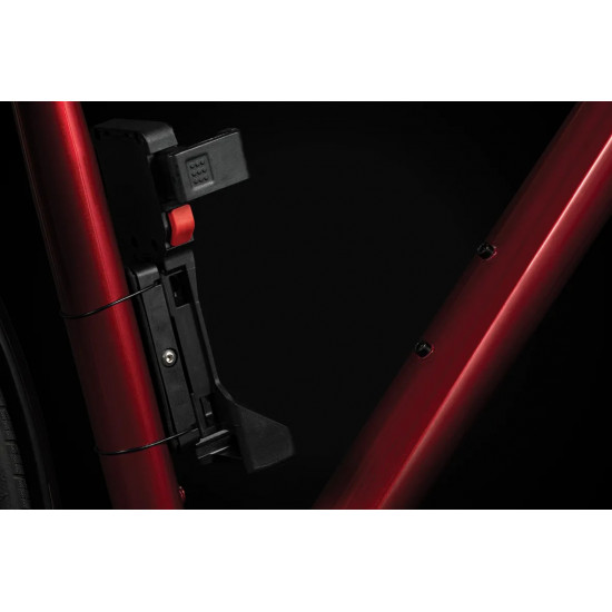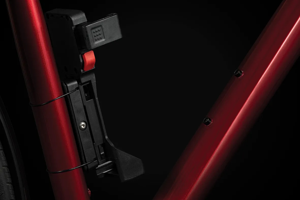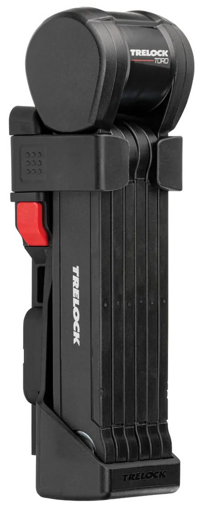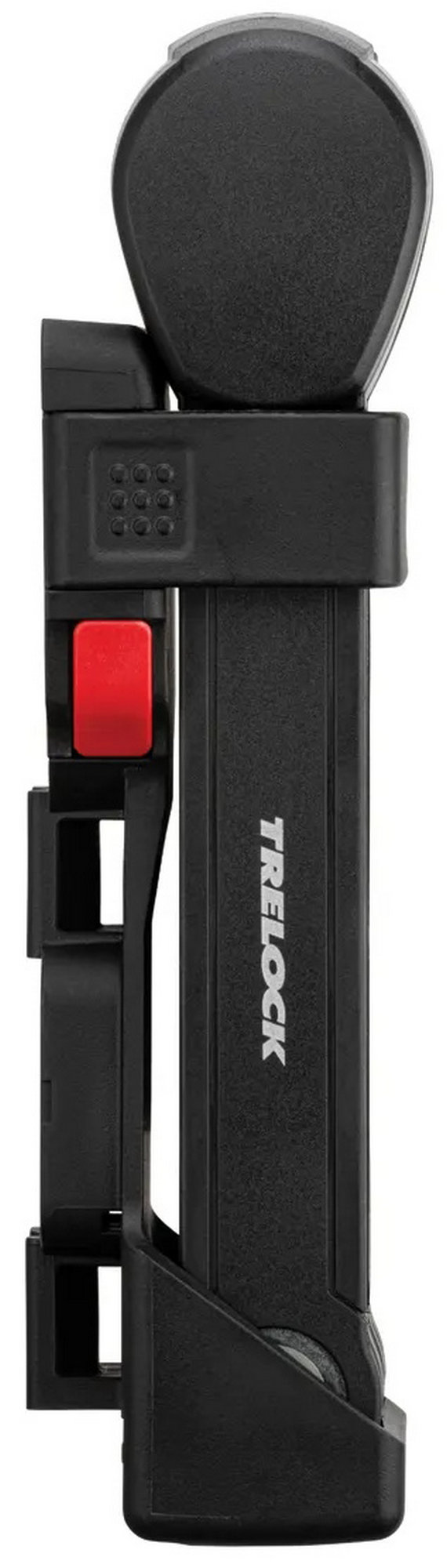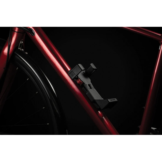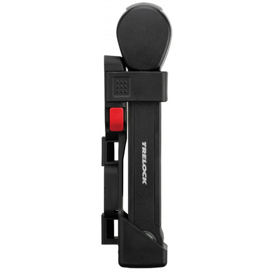 The FS 580 is our strongest folding lock in the series. The special highlight, however, is the back of the bracket: here, an Apple AirTag or a Samsung SmartTag can be hidden inconspicuously and securely. With the tags, the bike can be tracked via smartphone with minimal effort. The rubberized links made of hardened steel can be unfolded up to 90 cm in length. Locking a bike to a stationary object is very easy. For convenient locking, the lock is equipped with a 360 degree rotatable insertion area on the lock head and a reversible key. The IN-X cylinder is protected from dust and dirt by a cover. The 90 cm version comes with the new X-PRESS bracket. The locking mechanism of the X-PRESS holder makes it even easier to remove and insert the lock. To remove the lock, press the red button and the lock is released. To secure the lock in the bracket again, simply press the brackets together.