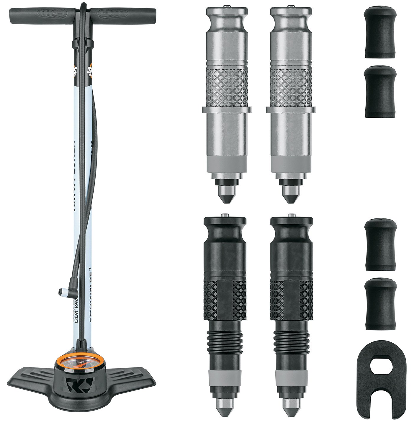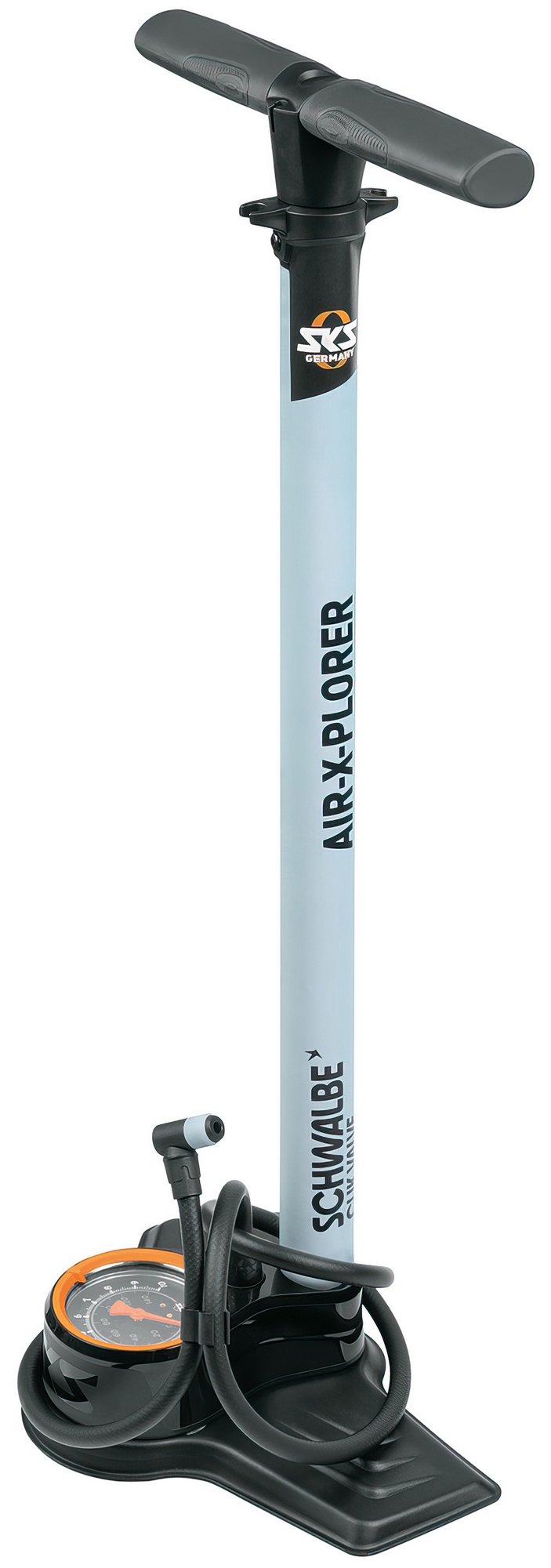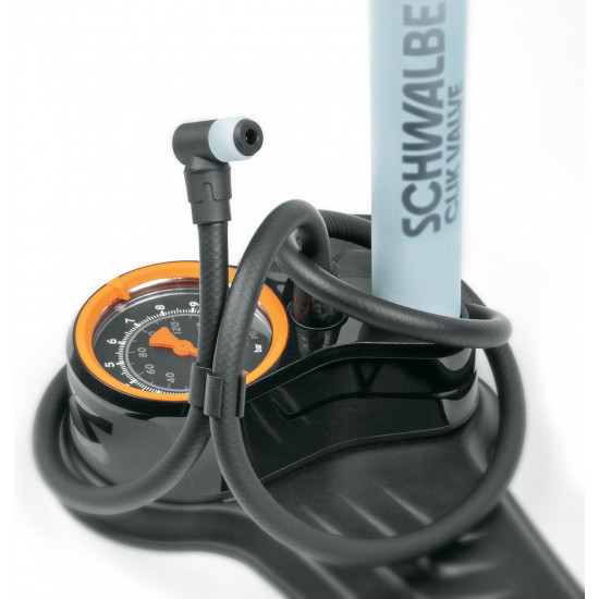 Air power in an SKS/Schwalbe design: The tried and tested AIR-X-PLORER comes in a unique look and is equipped with the SKS CLIK TEC valve head. This can be easily attached to the new Schwalbe Clik valve with an audible click. Other features of the pump include the large precision pressure gauge, the sturdy stanchion tube and the ergonomically shaped handle.