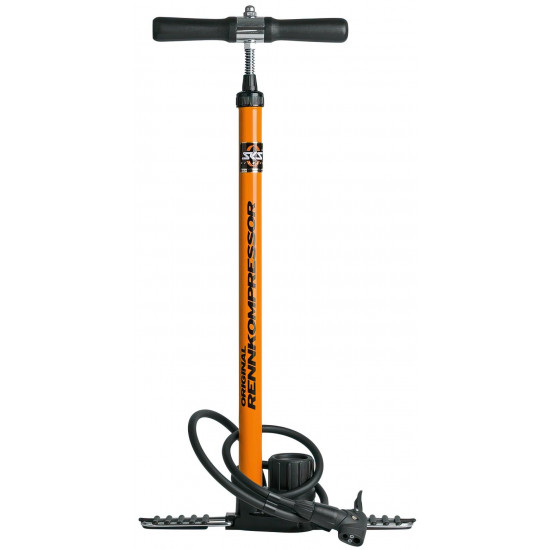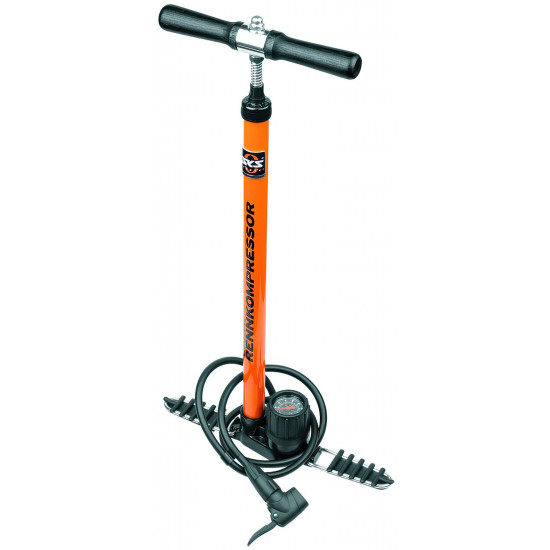 The SKS RENNKOMPRESSOR has been the most popular pump in international cycling for more than 50 years. The solid metal tube, the cast iron base, precision pressure gauge and the black wooden handle are proof of top quality. The feet are foldable and make transportation easier. The stand pump is supplied in authentic SKS orange and pumps bicycle tyres up to 16 bar/230 psi.