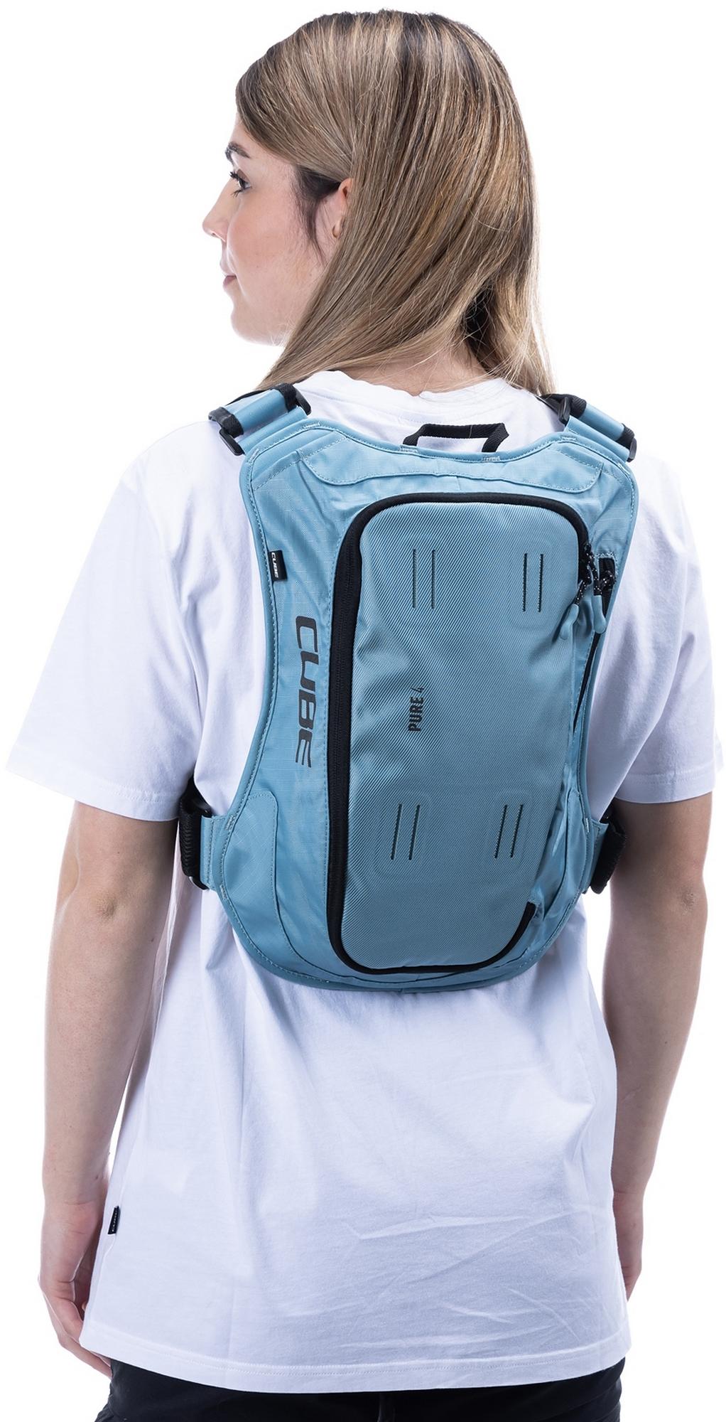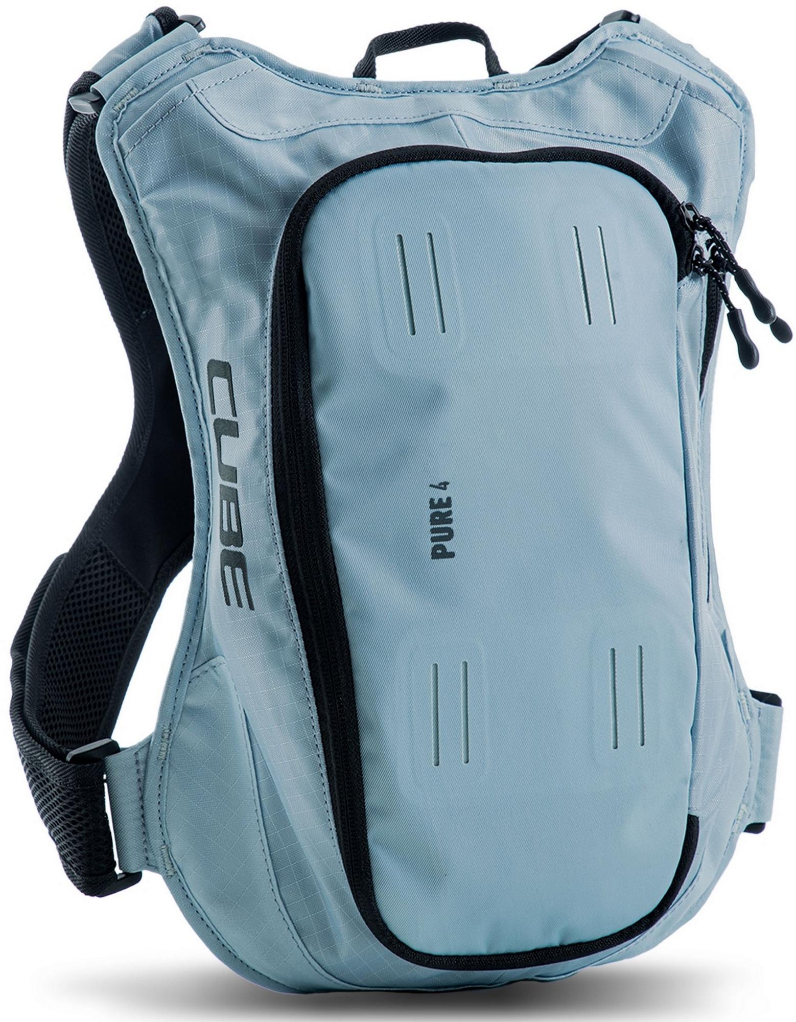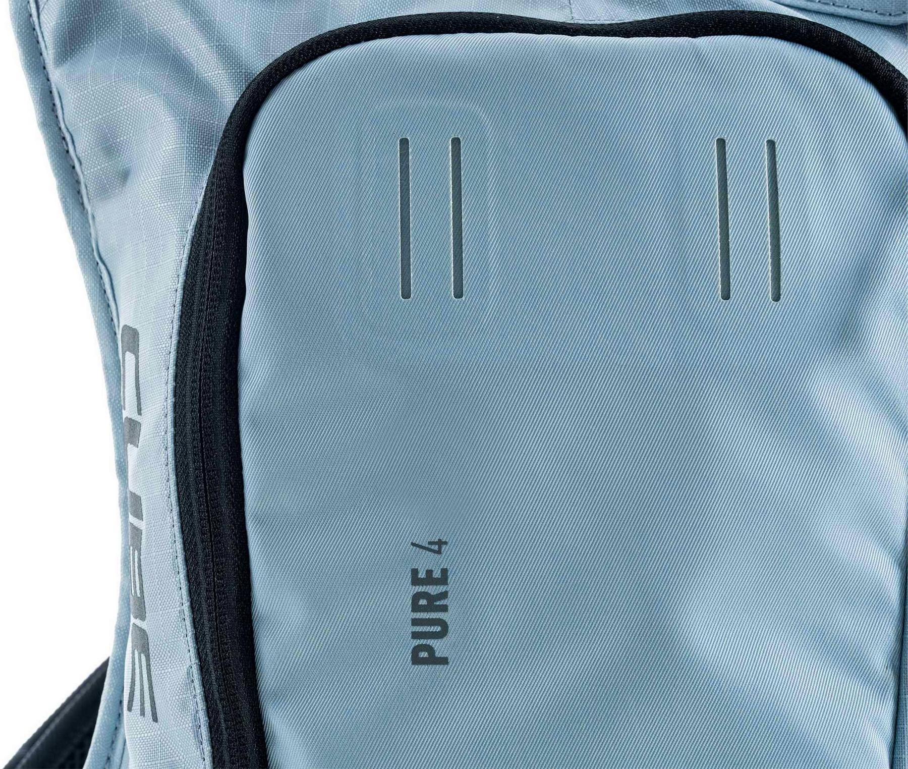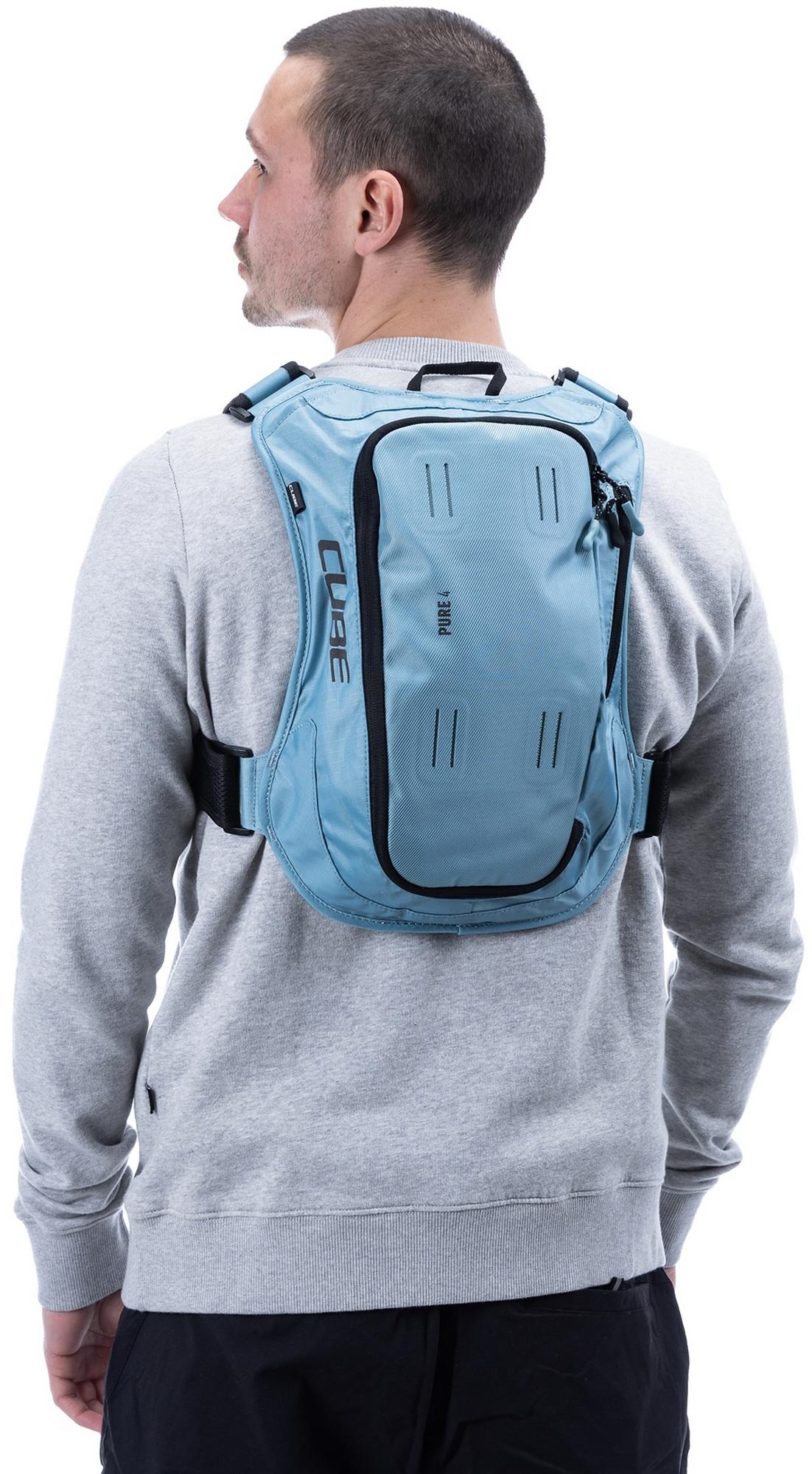 Small and smart: the pure 4 has everything you need from a backpack and nothing you don't. We pared it back to the essentials you'll need on shorter tours without having to carry extra weight. It's hydration system-compatible with outlets on both sides for the drinking tube, while mesh pockets in the main compartment keep everything neatly organised and are great for stashing bars, multi-tools and other small items. A side zip pocket keeps your smartphone or other essentials safe and within easy reach. We also incorporated our x-shape shoulder system that fastens across the chest, so the backpack stays comfortable and stable without cutting into your stomach, leaving you to breathe freely while you sweat the climbs or rail the trails. The backpack also features the versatile molle system, so it's easy to securely attach the small cube gear bag 1 using the integrated touch fasteners for practical extra storage.