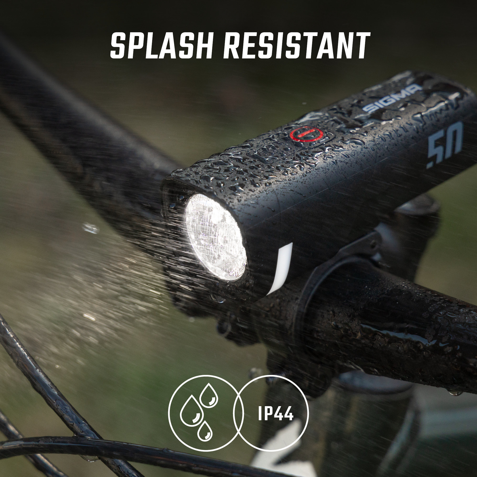 - WIND AND WEATHERPROOF The AURA 50 is ready for all cycling adventures. It is splash-proof to IP44 – ideal for all weather conditions in urban traffic.