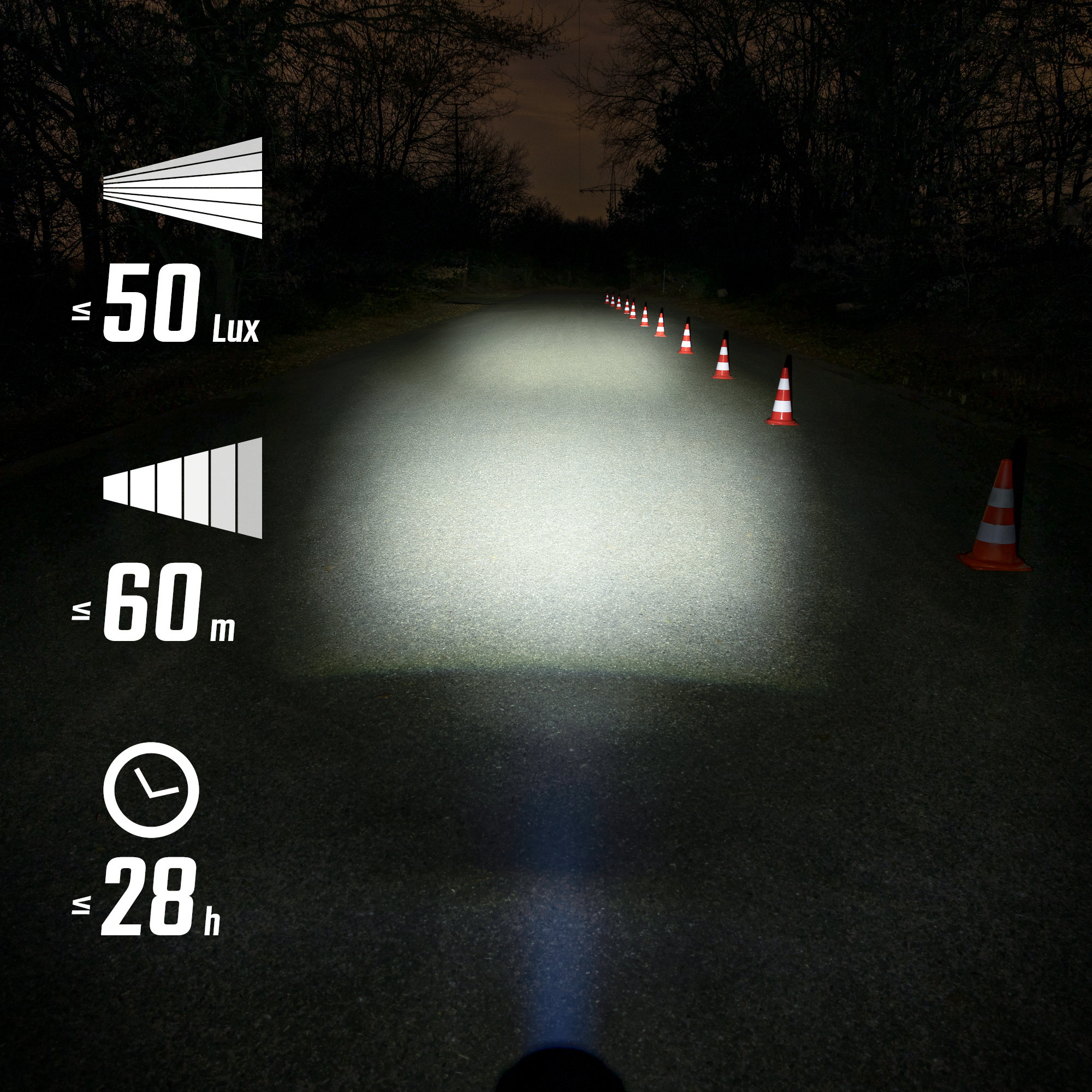 The AURA 50 has two light modes. In high mode, it reliably illuminates your path for up to 9 hours, and in ECO mode for up to 28 hours! Thanks to the memory function, the AURA 50 lights up the same way the next time you switch it on as it did when you switched it off.