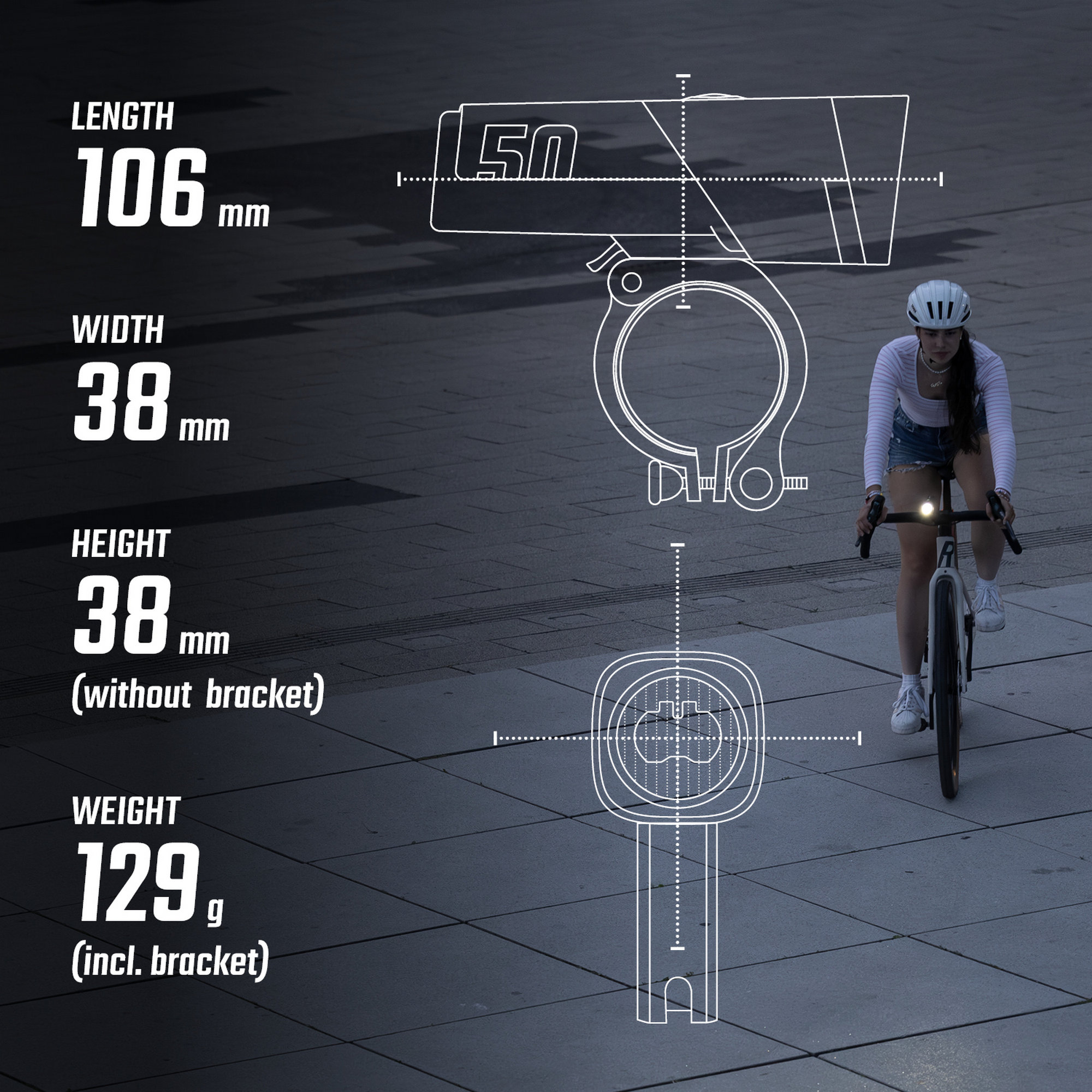 The AURA 50 is more than just light – it is your smart companion through everyday life in the city and beyond. With 50 lux and a light range of up to 60 metres, it gets you safely to your destination, whether its to the office in the morning or home in the evening. Thanks to the automatic brightness sensor, it adapts to the light conditions – for the perfect balance of visibility, efficiency and freedom on two wheels. New: Thanks to the USB-C connection, the AURA 50 can now be charged even faster and more conveniently – ready for every new adventure.