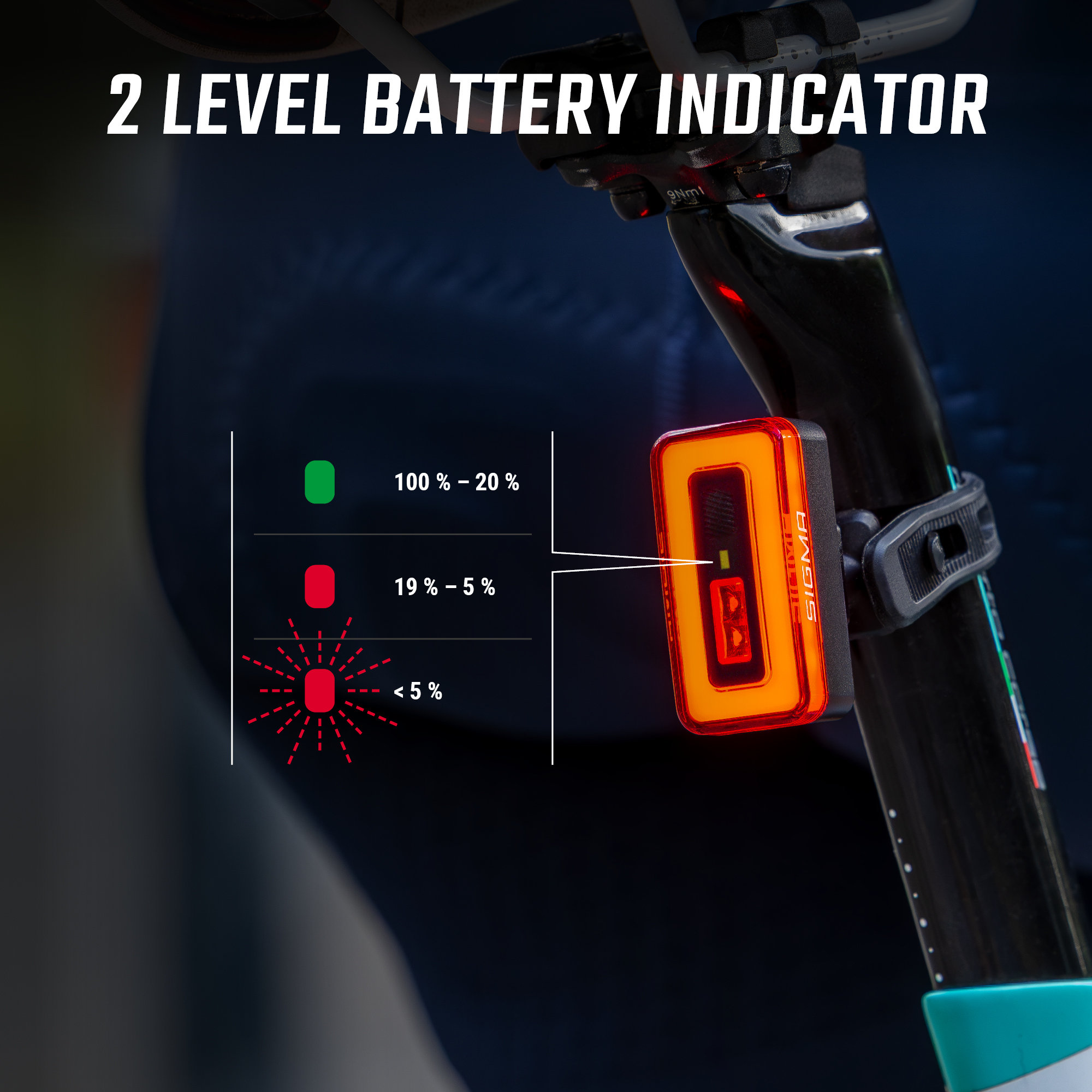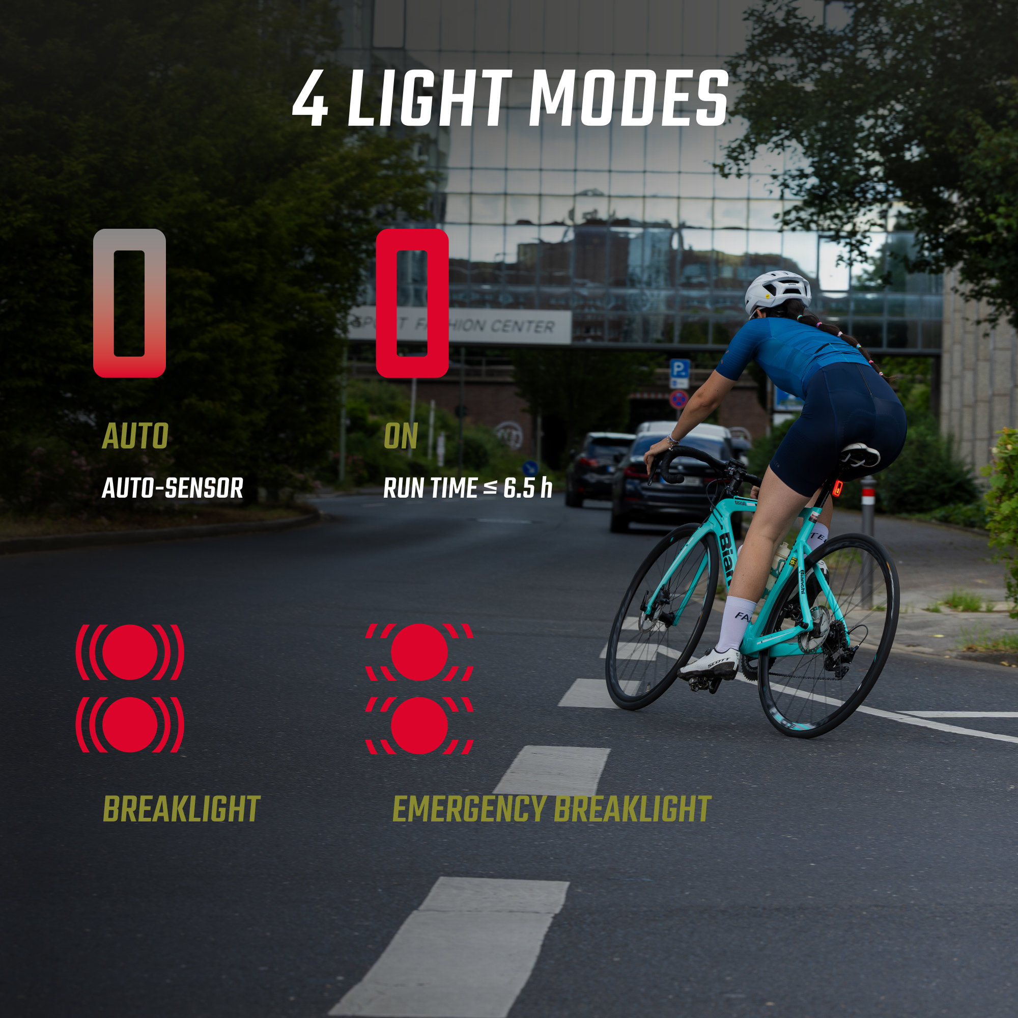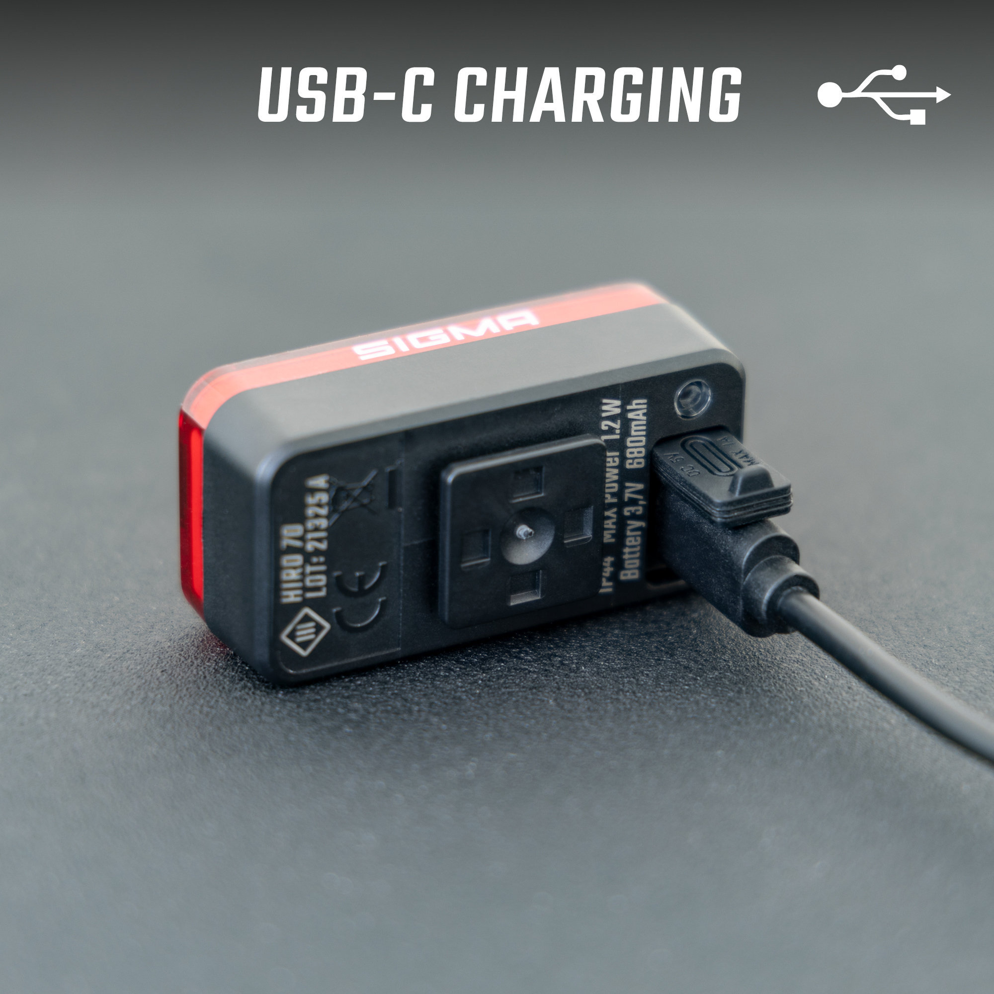 - RECHARGEABLE The HIRO 70 features an integrated rechargeable battery. The rear light can be fully recharged via USB-C within three hours. This saves money and protects the environment.