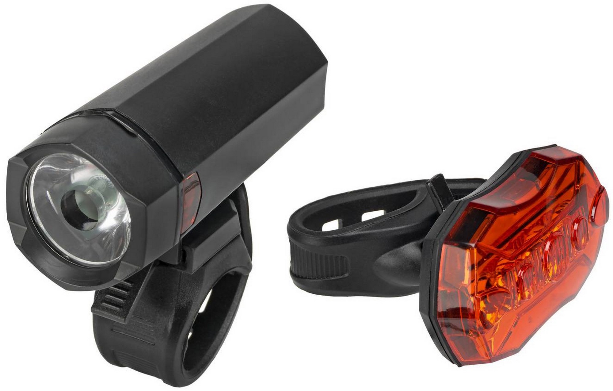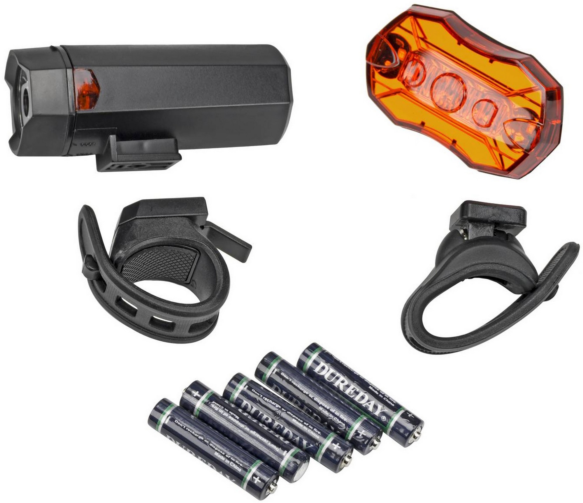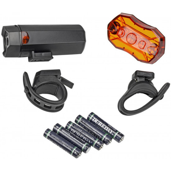 - Includes: Front lamp, rear lamp, 5 AAA batteries, mounting bracket for handlebar, mounting bracket for seat post