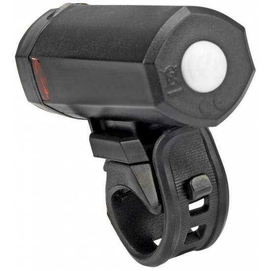Azimut Hexagon 40lm + Rubin 5LED is a bicycle light set with batteries. The front light is equipped with 1 Watt LED with max visible light at very high 40 lumens. Front lamp mounting bracket features quick release function for quick and easy lamp removal/install. Front lamp bracket is 360 degree adjustable. Water proof lamp bodies are made of light and durable plastic. Both leamps feature toolless lamp mount with elastic rubber strap. Rear lamp can be mounted on seatpost vertical and horizontal.
