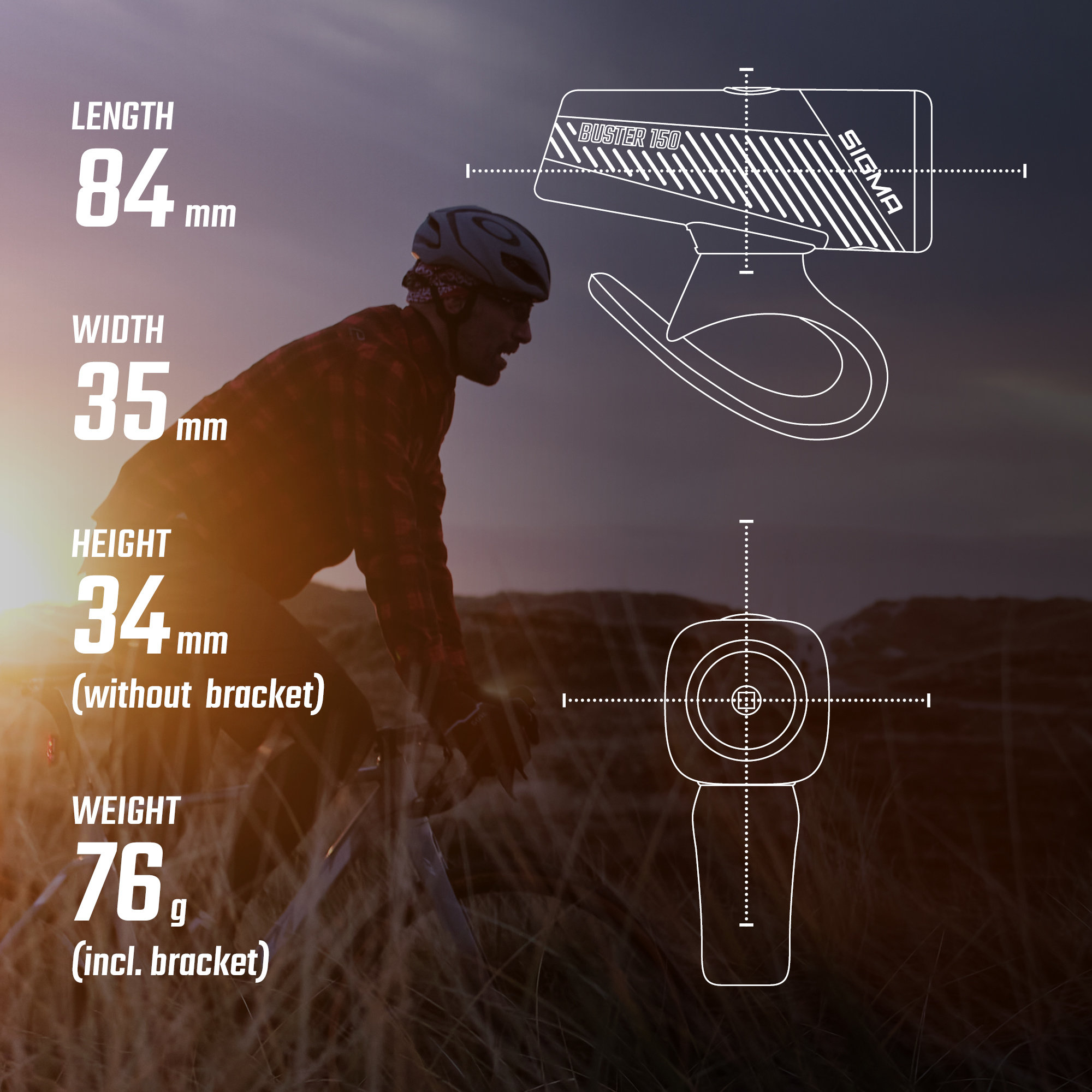 - PERFECTLY LIT The high-quality, high-power ams-OSRAM LED and the converging lens developed specially by SIGMA gives the BUSTER 150 very even light distribution across the entire lighting pattern. The light offers you all the the necessary safety, even during fast rides or on poorly lit trails.
