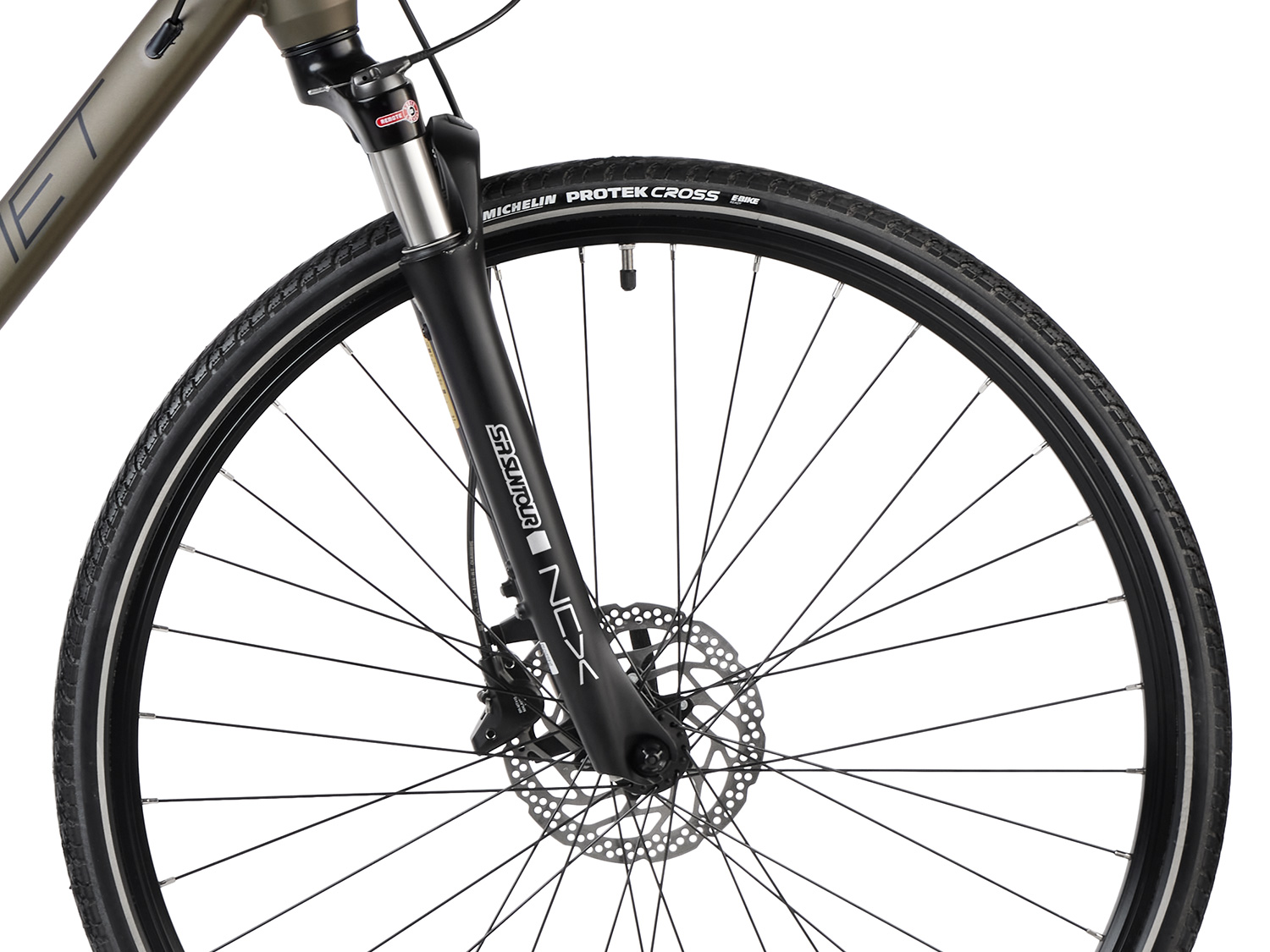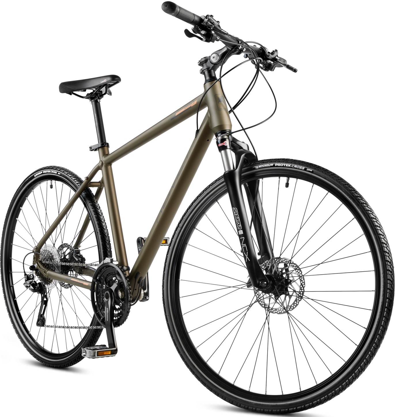The ROMET CROSS collection is made up of men's and women's bikes designed for recreational riding almost on any terrain. Comfortable geometry and suspension forks combined with large 28 inch wheels, equipped with off-road tyres - make them ideal multi-purpose bikes where speed of travel does not force a compromise on comfort. ROMET CROSS bikes have drivetrains with a large number and range of gear ratios to make pedalling both uphill and downhill easy and efficient. We added height-adjustable seatposts and sporty saddles to the aluminium frames in two shapes: classic and with a slightly lowered, bent top tube for comfortable ascent and descent to ensure the most comfortable mileage over varied terrain. ROMET CROSS bikes are just as fast and versatile on asphalt roads as they are on easy terrain off the beaten track, and the straight handlebars provide confident and easy handling.