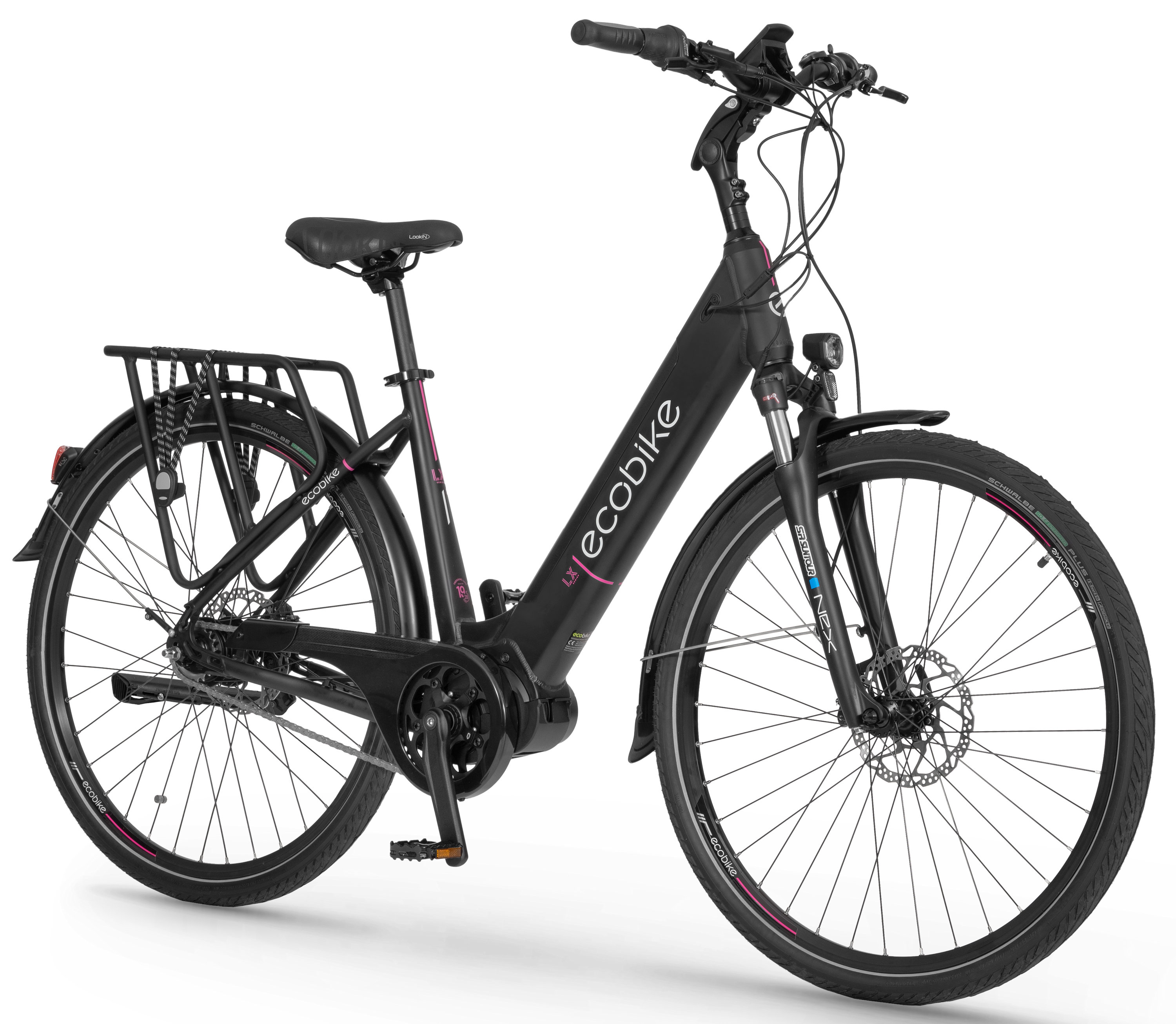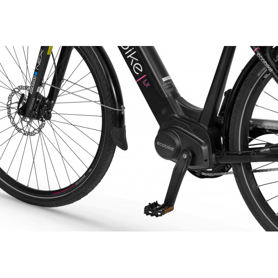 The frame geometry used in the LX is not only pleasing to the eye due to a perfectly matched battery or interesting design, but also works well in practice. The new design allows you to get in comfortably and take the optimal position for short journeys or longer trips. The changed ergonomic makes a great distribution of mass, it improves the grip of the battery, as well as its insertion and removal. The heart of the Ecobike LX is the developed and used by us for a long time Ananda mid drive. Its high torque of 100 Nm ensures efficient performance support even on steep climbs. Equipped with a pressure sensor, it enhances a unique driving experience, which remains smooth even in difficult conditions. The secret of good performance is a 48V system powered by a powerful LG battery. You will appreciate the control panel with a color display. It has been equipped with a dusk sensor that automatically turns on the bicycle lighting after dark. The user-friendly interface ensures easy, intuitive operation, and there are many functions at your disposal and configurable electric assist. Even the best system will not provide an interesting driving experience without finest components. The Shimano Nexus 7 derailleur is the crucial position in the LX specification, which is ideal for city traffic, as you can shift gears even when stop at traffic lights. It is also characterized by great durability and resistance to external factors. We have also used a SunTour Nex shock, Shimano hydraulic disc brakes, and strong Shcwalbe Energizer Plus tires - all of which makes the LX is a solid bike that can handle many demanding routes. The Ecobike LX also has been equipped with a rack, fenders, a comfortable Selle Royal gel seat and complete lighting, so it is immediately ready for your first journey.