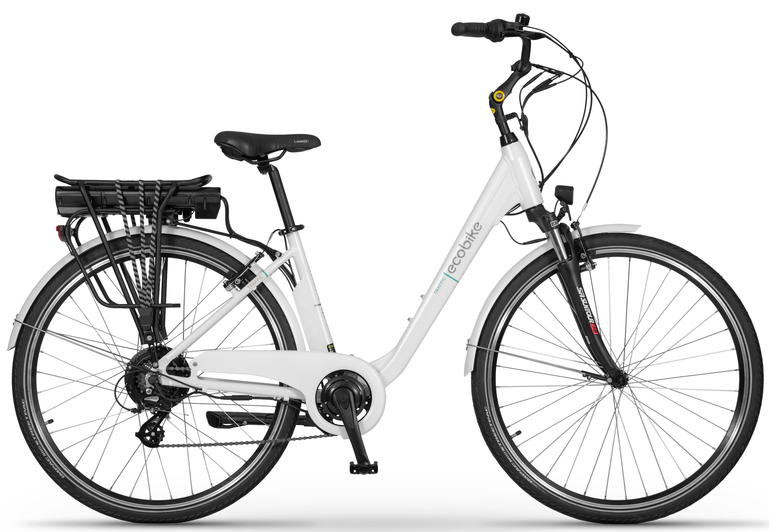 In addition, the bike will meet expectations regarding comfort and safety. Traffic is equipped with complete lighting powered by the main battery, Shimano Altus gears, SunTour CR8V suspension fork, adjustable stem, fenders, and a comfortable Selle Royal saddle.