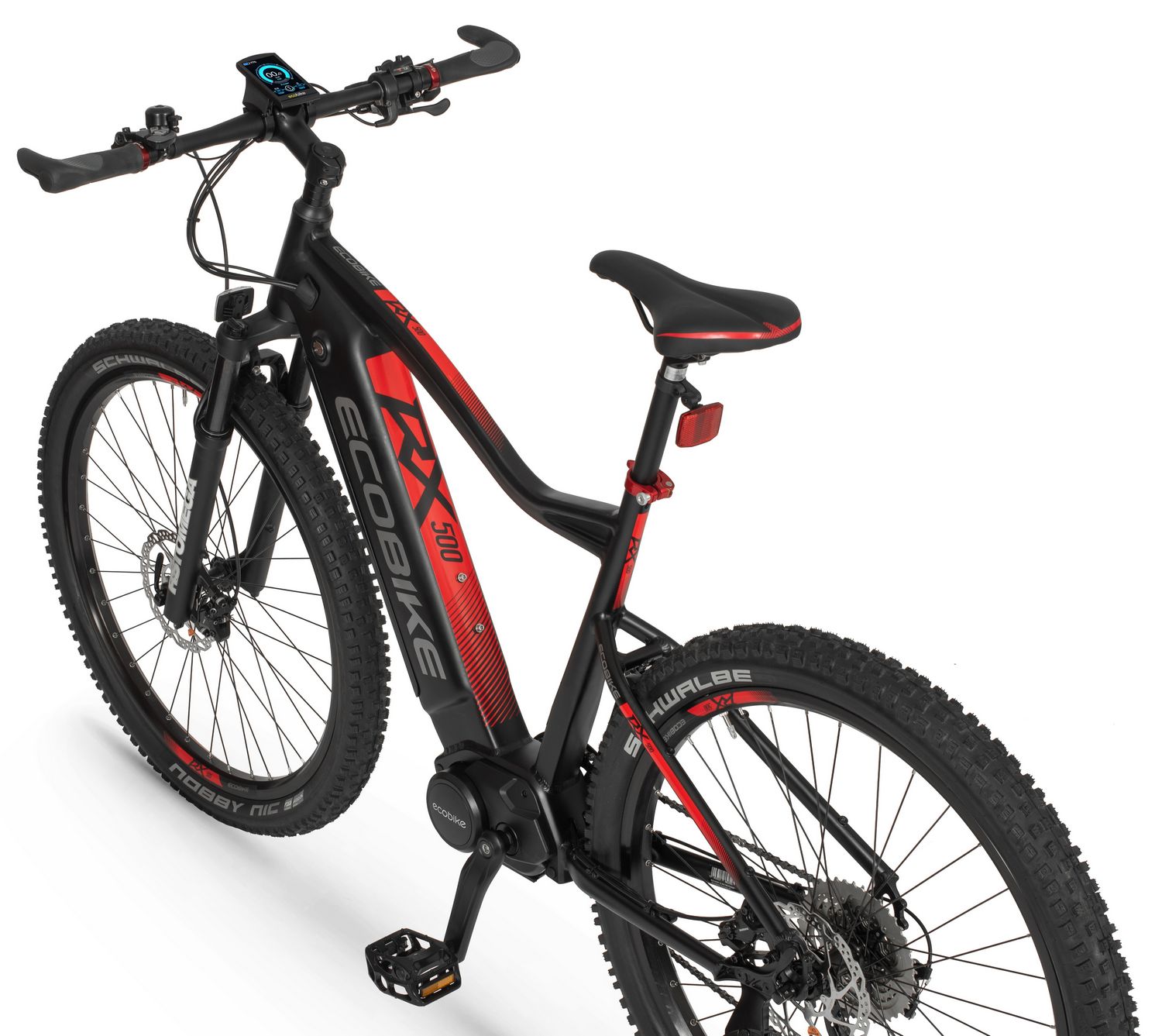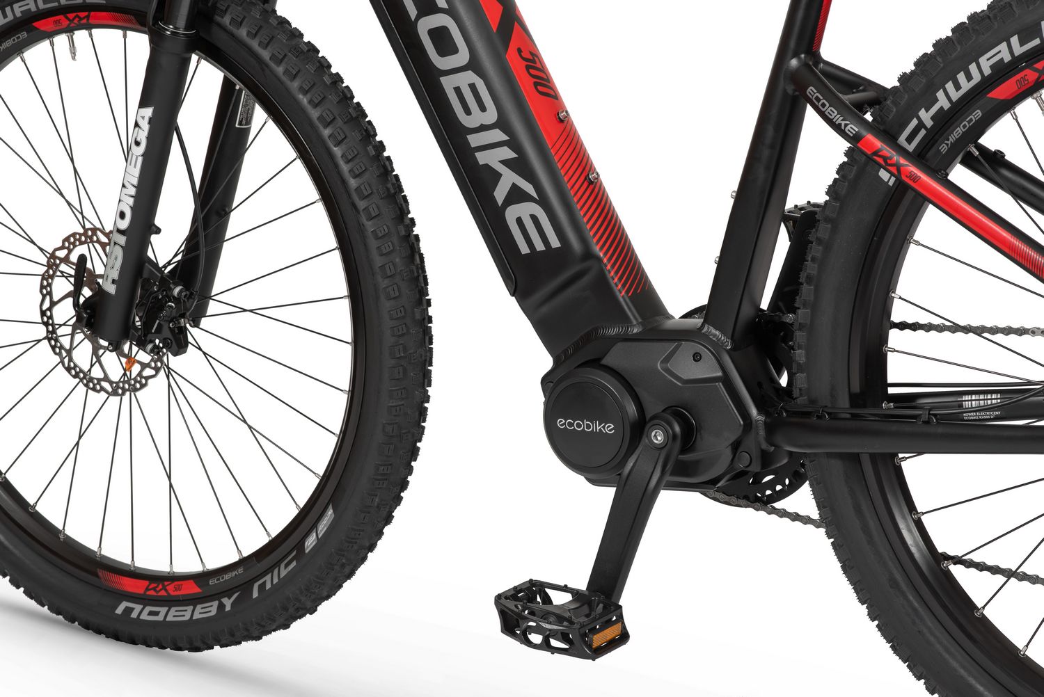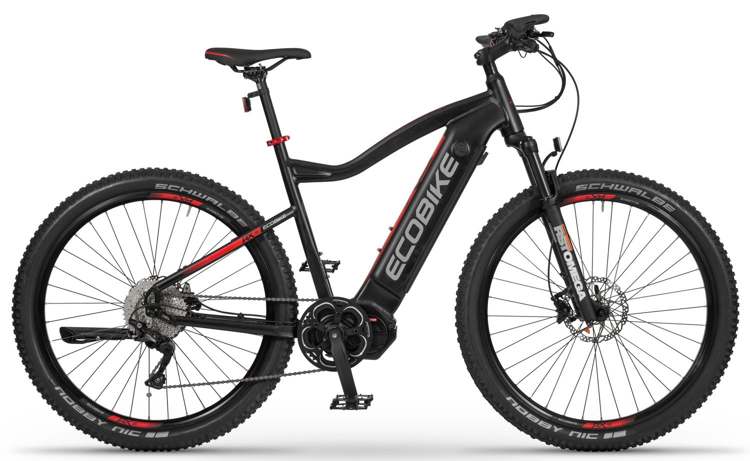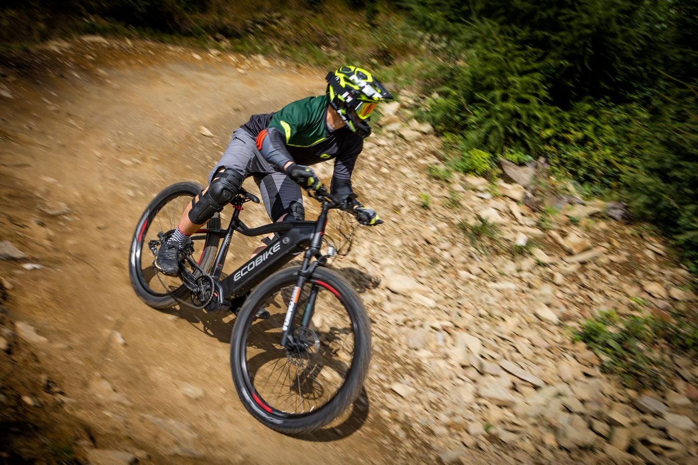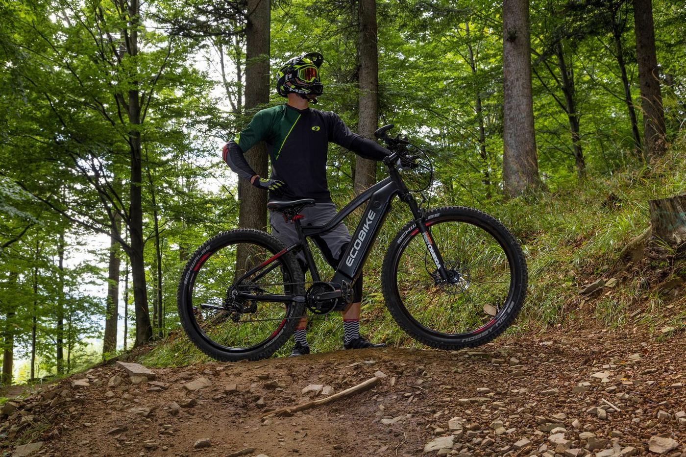Ecobike is one of the first e-bike manufacturers in Europe. This means company has a many years of experience in electric bikes manufacturing and it can offer an ideal price vs quality ratio. World-class components assembled carefully with love for bicycles in Poland. All these advantages gained trust across the entire European continent. Forget about all you haven't been able to achieve before. Choose a destination, and the technology will make sure you are exactly where you want. Meet the new RX500 model and see, how easy today is what seemed impossible yesterday. Ecobike RX500 is an MTB e-bike equipped with the most advanced solutions available on the market. The heart of the bike is the Ananda middrive, which develops a maximum power of 960W, and its torque reaches up to 136 Nm. Such power in two-wheelers so far has been only available for motorcycles. That is why you will overcome any hill with amazing ease. Places you have never reached by bike will become a new direction of your adventures, and even a simple ride will provide you with a lot of emotions. The energy used by the electric drive system comes from a 48V LG battery. You can choose two options: 13 Ah with 624 Wh or 17.5 Ah with 840 Wh. Interconnected intelligent engine and battery systems will ensure that you can enjoy your ride as long as possible. The battery has a SMART BMS system that constantly monitors its operation and records the charging circuits. The system is supported by a display with a color screen. It has been equipped with a dusk sensor that automatically adjusts the screen backlight to the conditions in which you are moving. Its friendly interface ensures intuitive navigation between individual functions and settings. Advanced technology requires an appropriate setting, but ergonomics and safety are the key. Frame concept makes the bike look great - the integrated battery is almost invisible, and the motor discreetly reveals its hidden potential. So that the good impression is not spoiled by the feeling of driving, we paid a lot of attention to the geometry. The optimal weight distribution was achieved by placing the motor at the right angle and placing the battery at the bottom of the structure. The RX500 is equipment for special adventures, so we used the RST Omega TNL TAPERED shock absorber and large wheels with wide Schwalbe Nobby Nic 29 x 2.6 tires for good traction in difficult conditions. A powerful middrive requires a solid shifting gear - the chain is shifted by a 10-speed SRAM GX derailleur. The Ecobike RX500 makes exploring difficult terrains easier than ever!DISTANCE:Capacity and range (Can be selected when ordering. If desired option is not shown, it may be sold out). IMPORTANT: distance is not MINIMUM-MAXIMUM range! Both values, for example 60-110km, are maximum distance depending on selected assist mode: [POWER]-[ECO] km. There is no minimum distance!, because it depends on many different factors. More info bellow.48V/13AH: 60-110 km (MAX POWER - MAX ECO)48V/17.5AH (LG): ENGINE:Voltage: 48 VMount: Central (mid-drive)Motor assisted speed: 50 km/h (Limited to 25 km/h in accordance with EU standard EN 15194)Torque: 136 NmMotor's brand: ANANDAPower: 250 WMaximum peak power (requires upgrade kit, which is NOT INCLUDED, upgrade on your own risk, we do not endorse it): 960 WBATTERY:Fuses: 30ALifespan: 700 chargesCharging time: 4-8 hoursType: Li-ionVoltage: 48 VCharger: 100-240V/54.6V 3A D typeCells brand: LGSmart BMS (Battery Managment System)Battery can be removed for chargingCHARGING TIME: 4-8 hoursFRAME: Hydroformed aluminiumFRAME SIZE: 21"FORK: RST OMEGA TNL Tapered, suspensionBRAKES: Shimano BL-MT401 hydraulic discCHAIN: KMC E10SCHAINWHEEL: 1-speedREAR DERAILLEUR: Shimano DEORE RD-M6000-GS 10-speedFREEWHEEL: Shimano DEORE CS-M4100-10 10-speed 11-42THANDLEBAR: Zoom MTB-AL-312BT, aluminium, riser 12mm, diameter in stem fixing spot (center): 31.8mm, length: 720mmSTEM: Promax MA-47, aluminium, fork steerer: 28,6mm, handlebar diameter: 31,8mm, length: 90mm)HUBS: Front hub: Shimano HB-TX505,36H CENTER LOCK / Rear Hub: Shimano FH-TX505-8 CENTER LOCKPEDALS: AluminiumRIMS: 29", reinforcedSADDLE: VELO VL-3363SEAT POST: ZOOM SP-C255, diameter: 27.2mm, length: 350mmSHIFTERS: Shimano DEORE SL-M6000-R 10-speedSPOKES: stainless steelTYRES: Schwalbe Nobby Nic 29 x 2.60 (65-622)WEIGHT: 27,9 kgSPEEDS: 10GRIPS: VELO VLG-1185AD3 Maximum load: 125 kgBattery capacity - is measured in Wh (watt hours) or Ah (amper hours) and usually correlates with the maximum distance bike can cover with a fully charged battery. More capacity - longer range.Maximum range - Specifies the maximum route length you can travel on one full battery charge. The distance depends on the rider's weight, battery capacity, weather, terrain difficulty as well as the level of selected support mode. Please note that over the years of use - battery capacity will become lower. This is a normal chemical process of Li-Ion battery cell aging. Improper use and/or modifications may reduce the maximum range.Bike weight - Total weight of all bicycle components - engine, battery, frame and accessories. EcoBike electric bicycles have the lowest weight-power ratio.Engine power - The nominal power of the electric bicycle's engine, which is legal in most EU countries.Maximum engine power - The power of the electric bicycle's engine, which can be produced without speed limiter and may require replacing some parts to handle the voltages/amperage for the desired power. Maximum engine power cannot be selected by the user without making some hardware/software modifications. Removing limiter may require to register bike as an e-moped. In such case, different road laws applied as well. Improper modifications can lead to a damage of the e-bike system and nor the seller, nor manufacturer will be responsible for any losses or injuries.Lifespan - stated number can be lower if stored and used improperlyMaximum speed is up to 25 km/h, which can be maintained by the engine. 