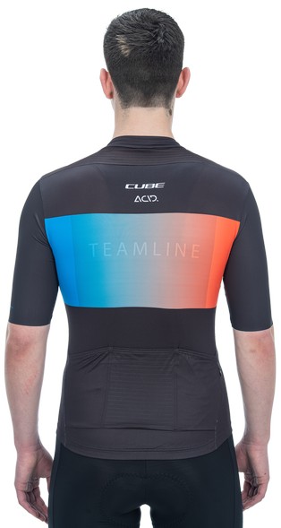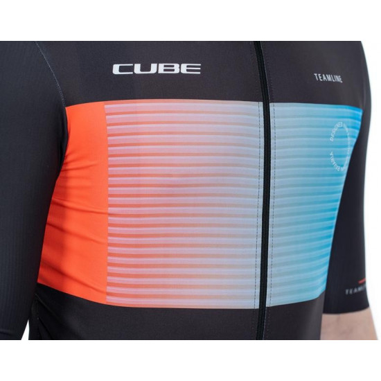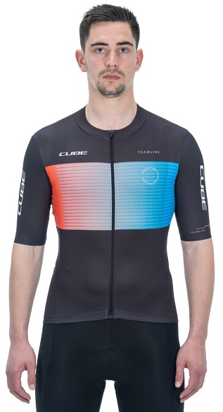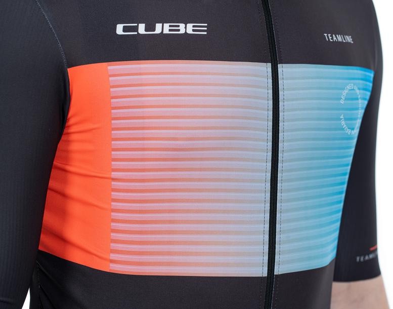 Slip on the CUBE TEAMLINE Jersey and enjoy the feeling of pure speed! The close-fitting design promises maximum aero gains whilst the soft hem with silicone gripper keeps everything right where it should be to leave you to focus on bettering your sprint speed. A full-length front zip delivers optimum ventilation on hot summer days and the water-repellent zip rear pocket keeps moisture away from your smartphone, keys and other essentials. And speaking of moisture: Not only is the fabric super durable, it's quick drying too with reflective details for added safety. If that doesn't get you pumped to ride, what will!?