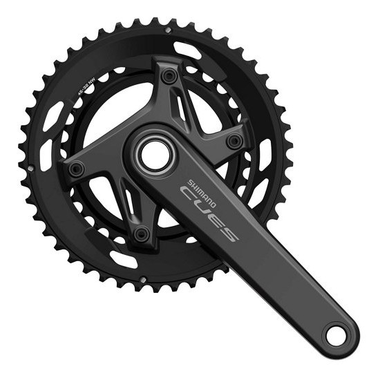 The Front Double SHIMANO CUES 2-PIECE CRANKSET delivers reliable performance and smooth pedaling for road and gravel. Wide-range cranksets are available in 50-34T or 46-32T configurations.