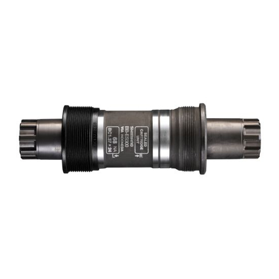 Shimano BB-ES300 Bottom bracket with round hollow axle and multi-toothing for Octalink cranksets. Suitable for frames with BSA thread (68 mm). Compared the power transfer of OCTALINK with the conventional square taper spindle, the 8-splined OCTALINK interface that connects bottom bracket and crank set increases the strength and rigidity for entire assembly. The Shimano BB-ES300-E Octalink bottom bracket is compatible with E-type front derailleurs.