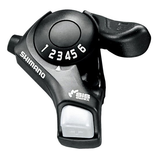 The SHIMANO TOURNEY SL-TX30-6R is a thumb shifter for mountain bikes that features SHIMANO's OPTICAL GEAR DISPLAY, which tells riders what gear position is selected while riding.