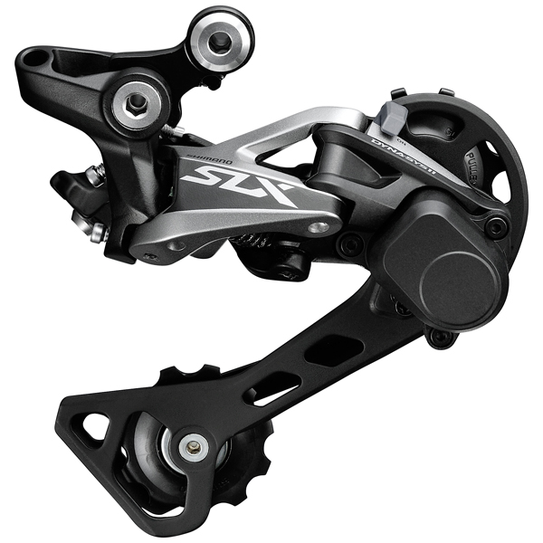 Sometimes the difference between cleaning a section or not is a well-timed, perfectly executed shift. An elegant new look and high-end technologies: The Shimano SLX 11-speed rear derailleur RD-M7000 GS. Where shift levers command, derailleurs respond. Now featuring at SLX lever, Shimanos SHADOW RD+ technology provides sharp and silky shifts along with chain stability and a reduction in chain slap thanks to a lockable rear derailleur position. The medium cage 11-speed rear derailleurs (RD-M7000 GS) for 1x11- and 2x11-speed systems offer a drivetrain capacity of 41-teeth. Dyna-Sys11 - The real advantage of 11-speed is the ability to have all the range you require without sacrificing the rhythm you need. SHADOW RD+ - less distraction quiet drive train. Rear Derailleur Stabilizer reduces chain slap. Simple solution for chain drop.