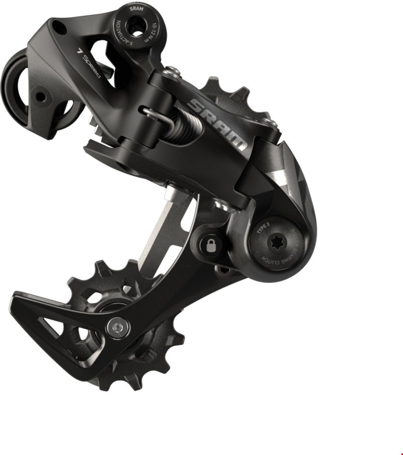 The 7-speed X-HORIZON rear derailleur makes shifting smooth and reliable no matter where you ride. Engineered to maintain consistent chain gap across all seven gears, X-HORIZON eliminates vertical movement for faster shifting, reduced shift force and an end to ghost shifting. Our , Type-3 ROLLER BEARING CLUTCH features a smoother torque curve for a quieter, more consistent operation and feel. The 12-tooth X-SYNC pulley wheel holds the chain in place, reducing bounce and chain slap. And CAGE LOCK technology makes wheel removal and installation easier than ever. Paired with the X01 DH 7-speed shifter, X-HORIZON forms the backbone of X-ACTUATION technology - and that means completely smooth shifting action.