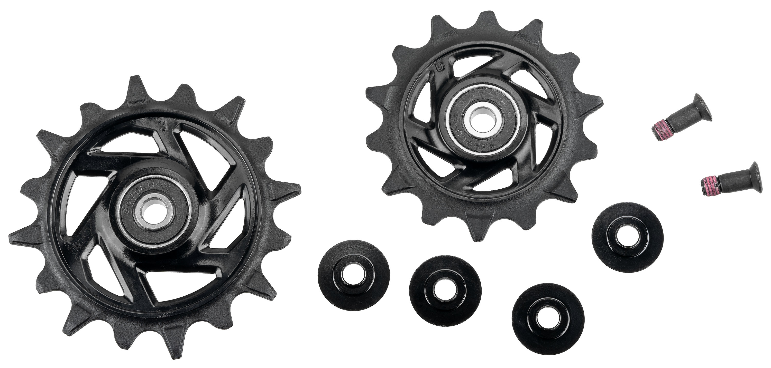 The Pulley Kit contains the jockey wheels for the SRAM X0 Eagle Transmission rear derailleur (RD-X0-E-B1). Guide pulley (top, 14 teeth) and tension pulley (bottom, 16 teeth) including two T25 stainless steel bolts.