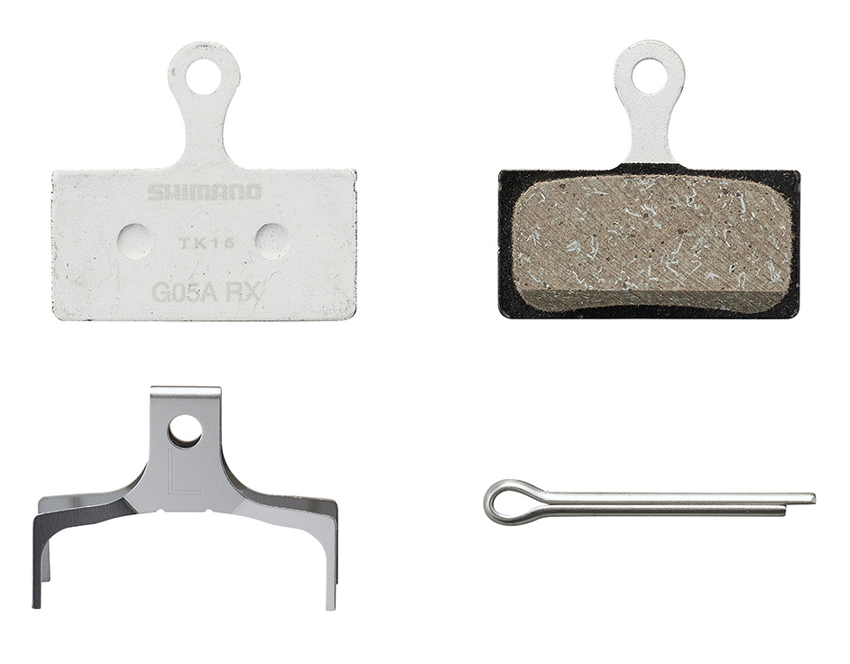 Shimano G05A disc brake pads made of resin and equipped with aluminum base plates. 50 % more wear resistant than its predecessor G03A.Brake compatibility (list may not be full): XTR BR-M9000, BR-M9020, BR-M987, BR-M985 / Deore XT BR-M8100, BR-M8000, BR-M785 / SLX BR-M7100, BR-M7000, BR-M675, BR-M666 / Deore BR-M6000, BR-M615 / Alfine BR-S7000, BR-S700 / BR-CX77 / BR-RS785 / BR-R785, BR-R517, BR-R317Weight: ~ 12 g (including spring and cotter pin)