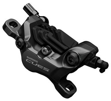 The hydraulic 4-piston brake caliper CUES BR-U8020 from Shimano for front or rear with Post-Mount and N04C Metal disc pads.