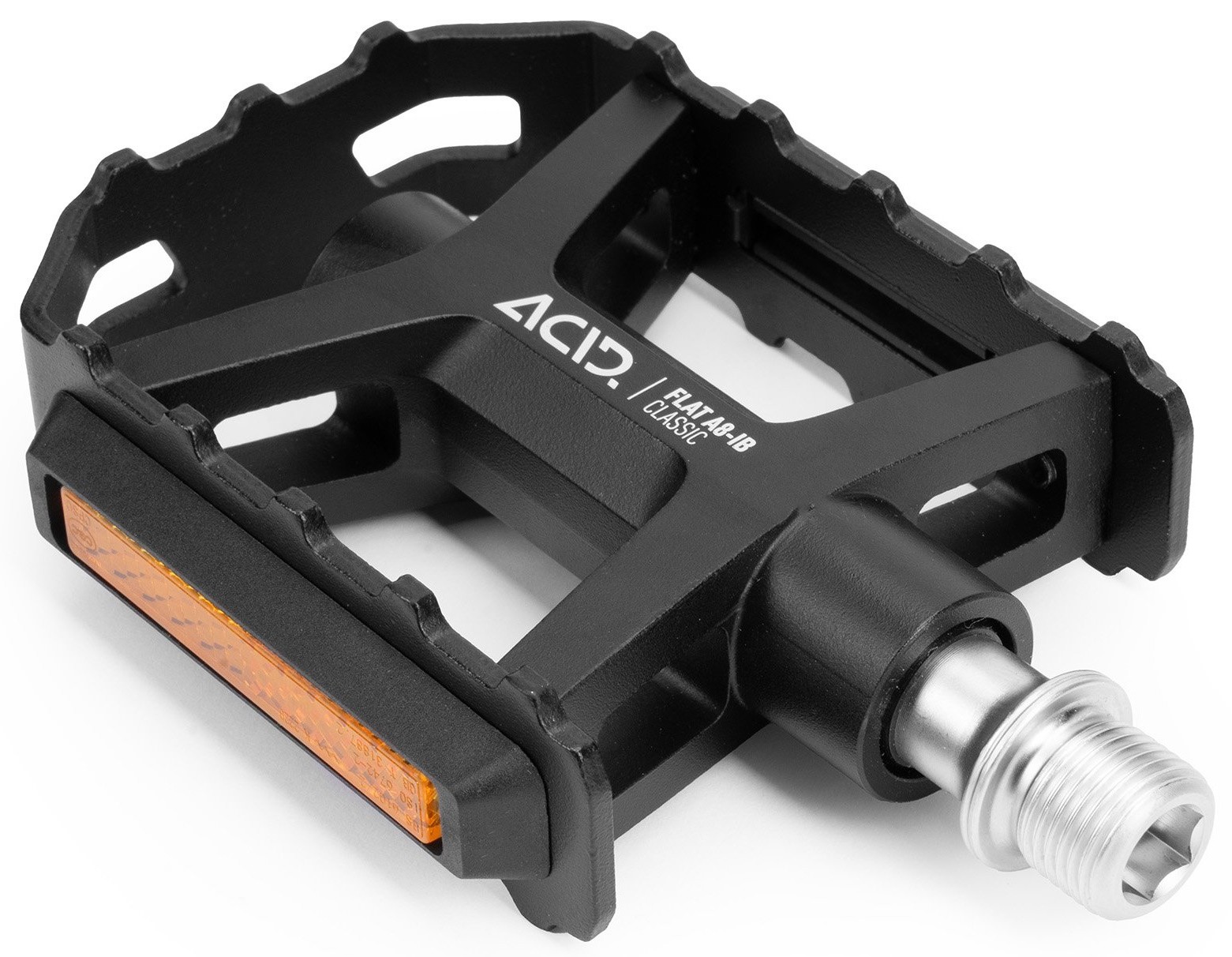 The ACID pedal FLAT A8-IB Classic features an aluminium cage with integrated pins for secure grip with any footwear. Combined with its classic design and silver colour scheme, it's a good match for a wide range of bikes and for all kinds of riding. The durable, CNC-machined Cr-Mo axle runs on a sealed industrial bearing and an LSL bushing, for long service life and smooth performance. And the StVZO-certified reflectors ensure compliance with German road traffic regulations and improved visibility to other road users.