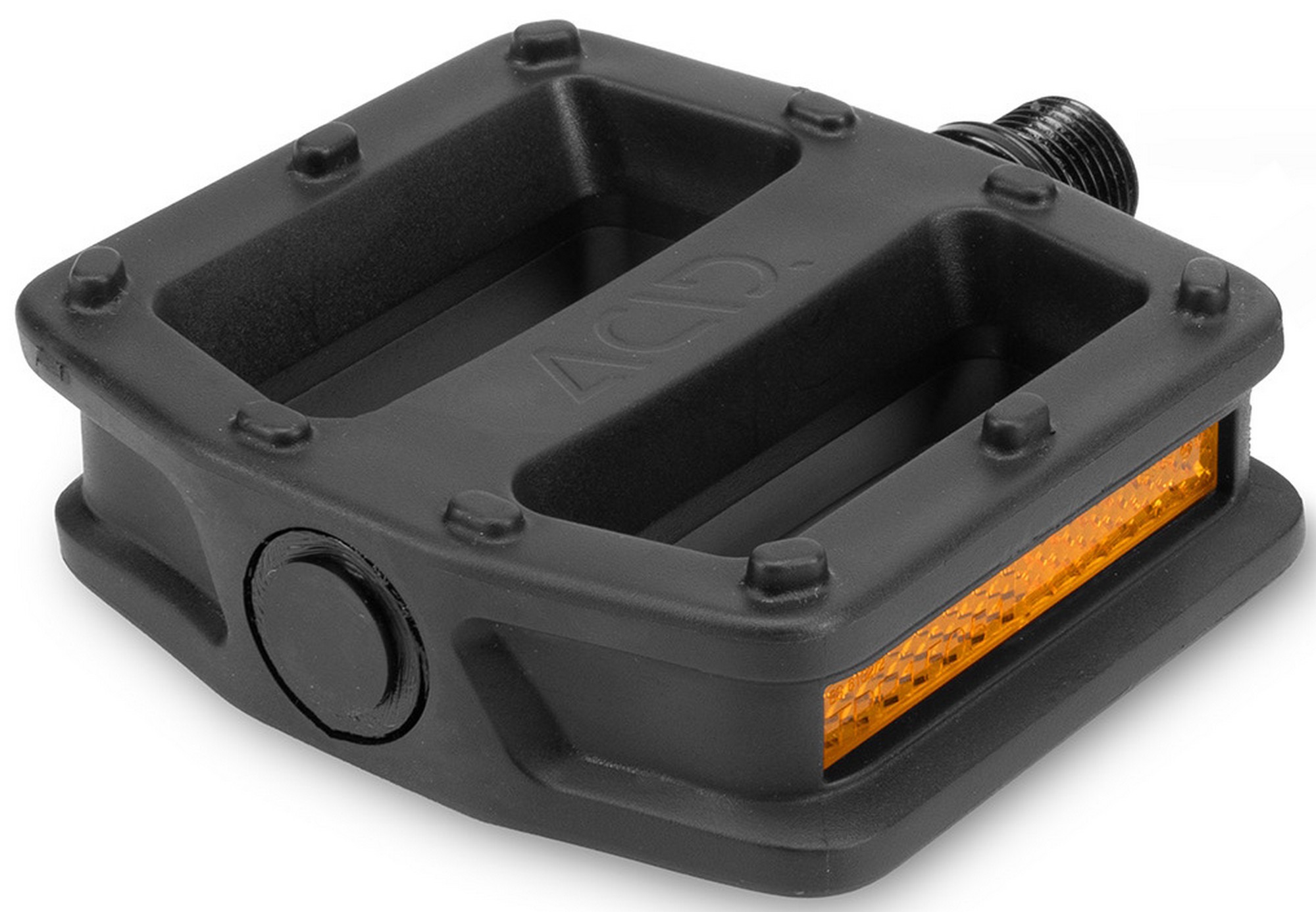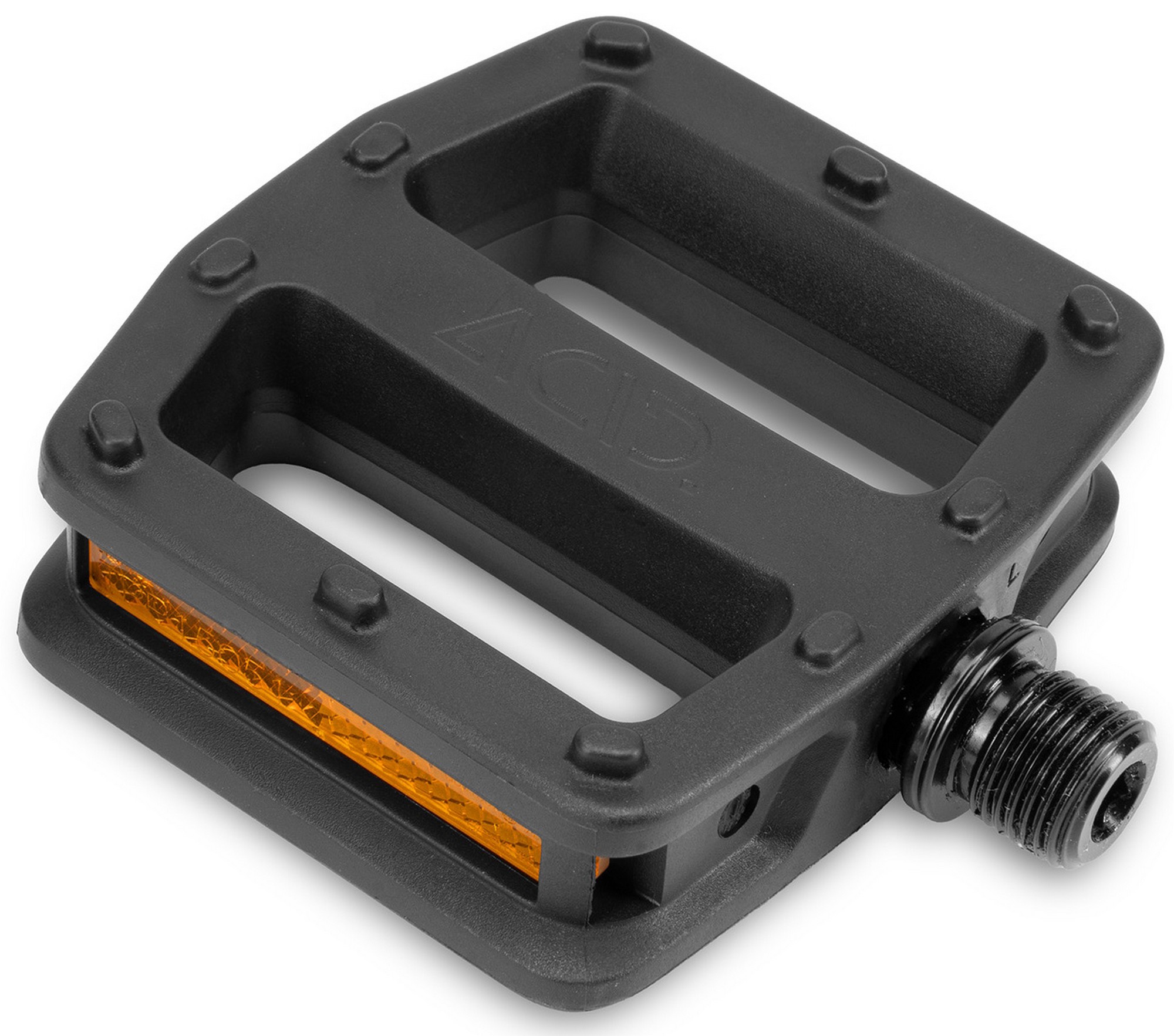 The acid pedals c4-zp rookie are available in three distinct sizes, to cater for the needs of a range of young riders. The tough plastic cage, durable boron axle, nylon bushing and attached reflectors are common to each version. For the small pedal, the concave tread is ergonomically suited to children aged around 3 to 5. At this age kids will also be held back by a pedal that's too large, which is why the platform is sized appropriately and features shallower pins.