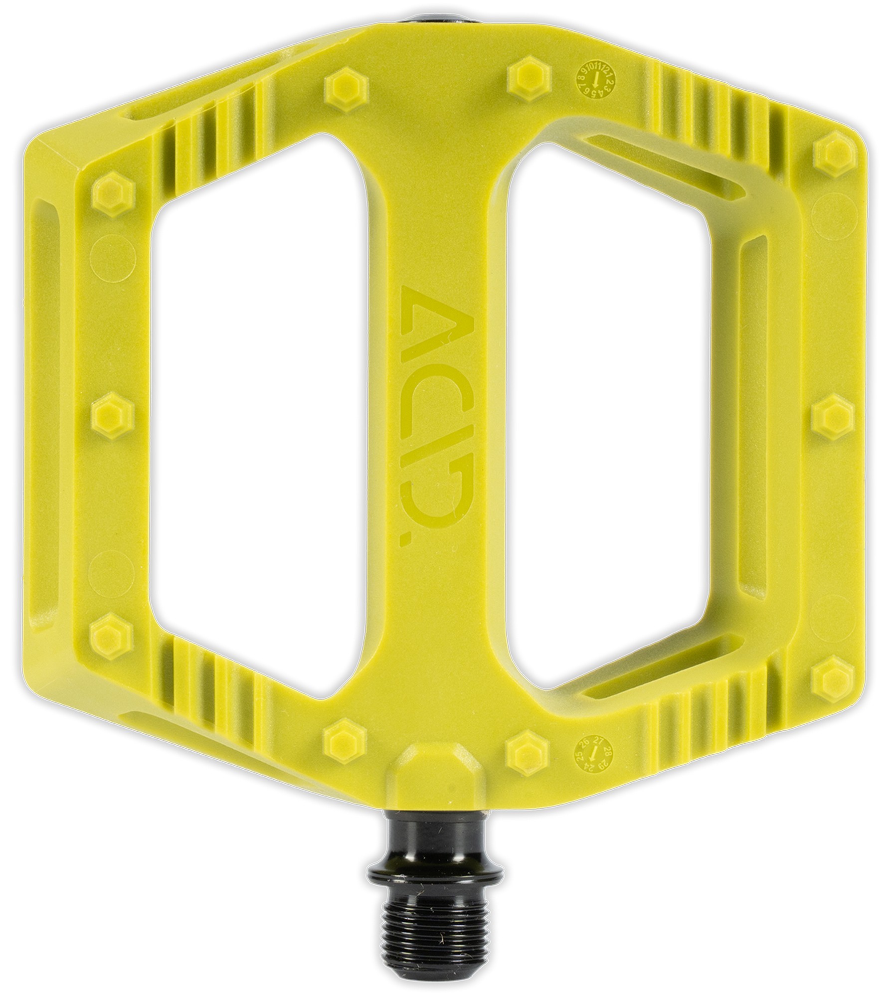 Available in four colours as well as black, the acid pedal flat c6-zp can be colour-matched to a range of cube grips and bike frames for a stylish look. The engineering thermoplastic pedal body makes use of 20% recycled material and features 10 large inmold pins for excellent shoe outsole grip ideal for mtb usage. And the cnc-machined cr-mo axle is both strong and durable, making use of double du bushings to provide a low maintenance bearing setup.