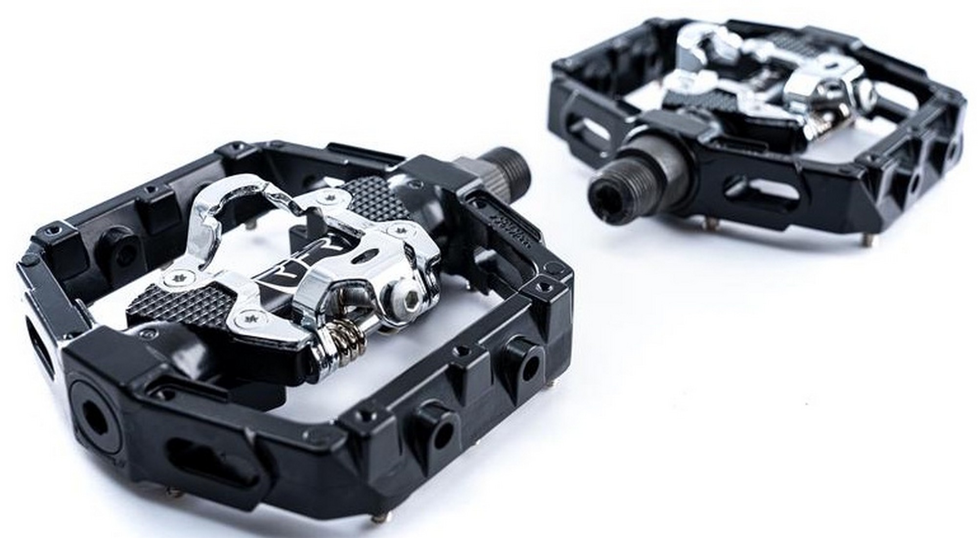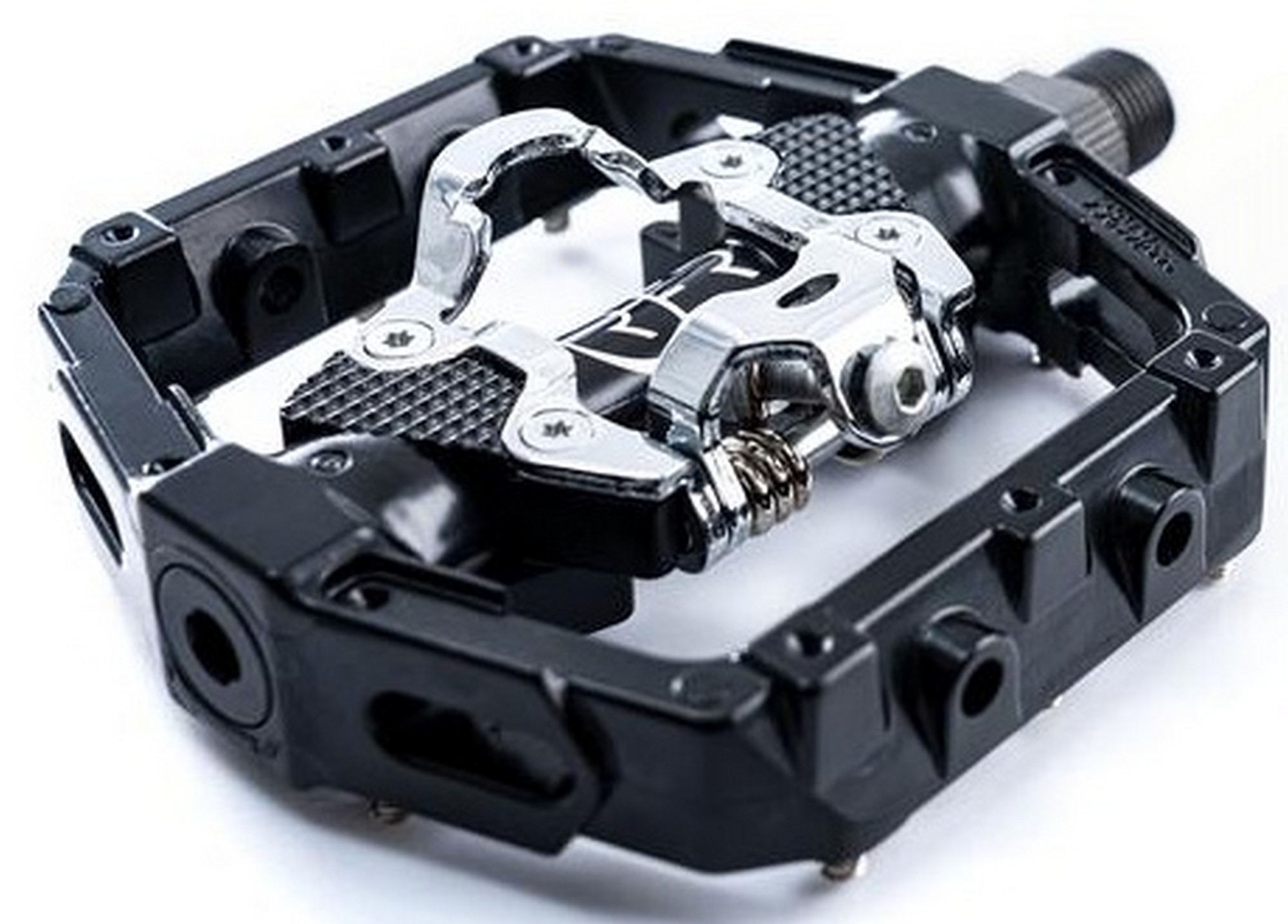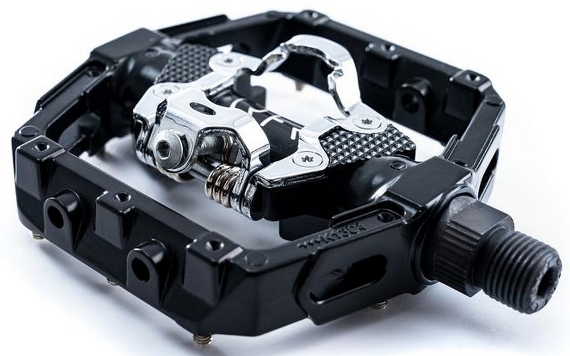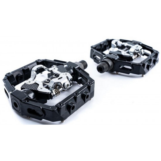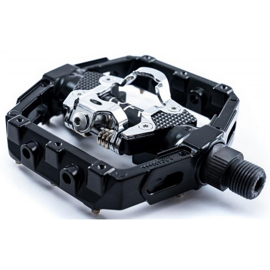This flat pedal with one side click-system is SPD compatible and installed with a CNC machined CrMo axle. Replaceable anti-slip pins are providing perfect grip on the bike.