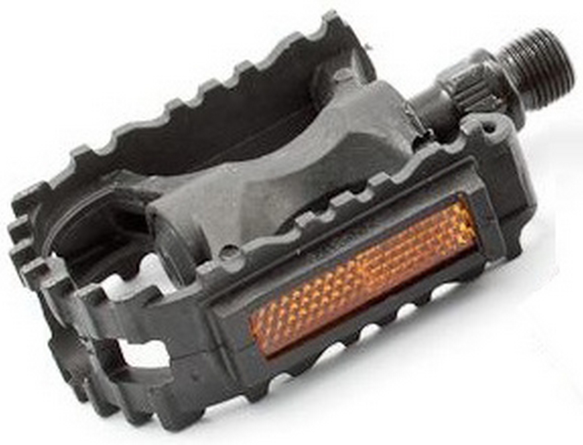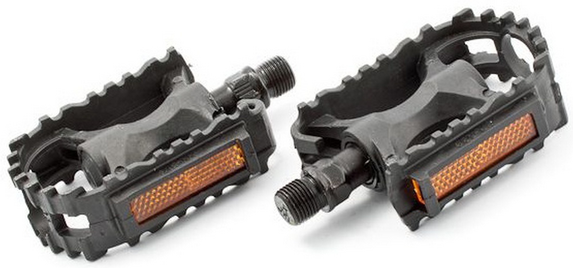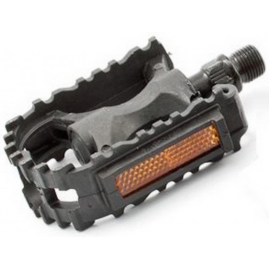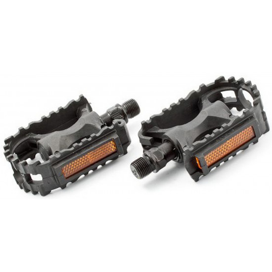 MTB style children bicycle pedals made from plastic and features durable steel axle. Pedals have ball bearings. For better visibility at night - pedals have integrated reflectors.