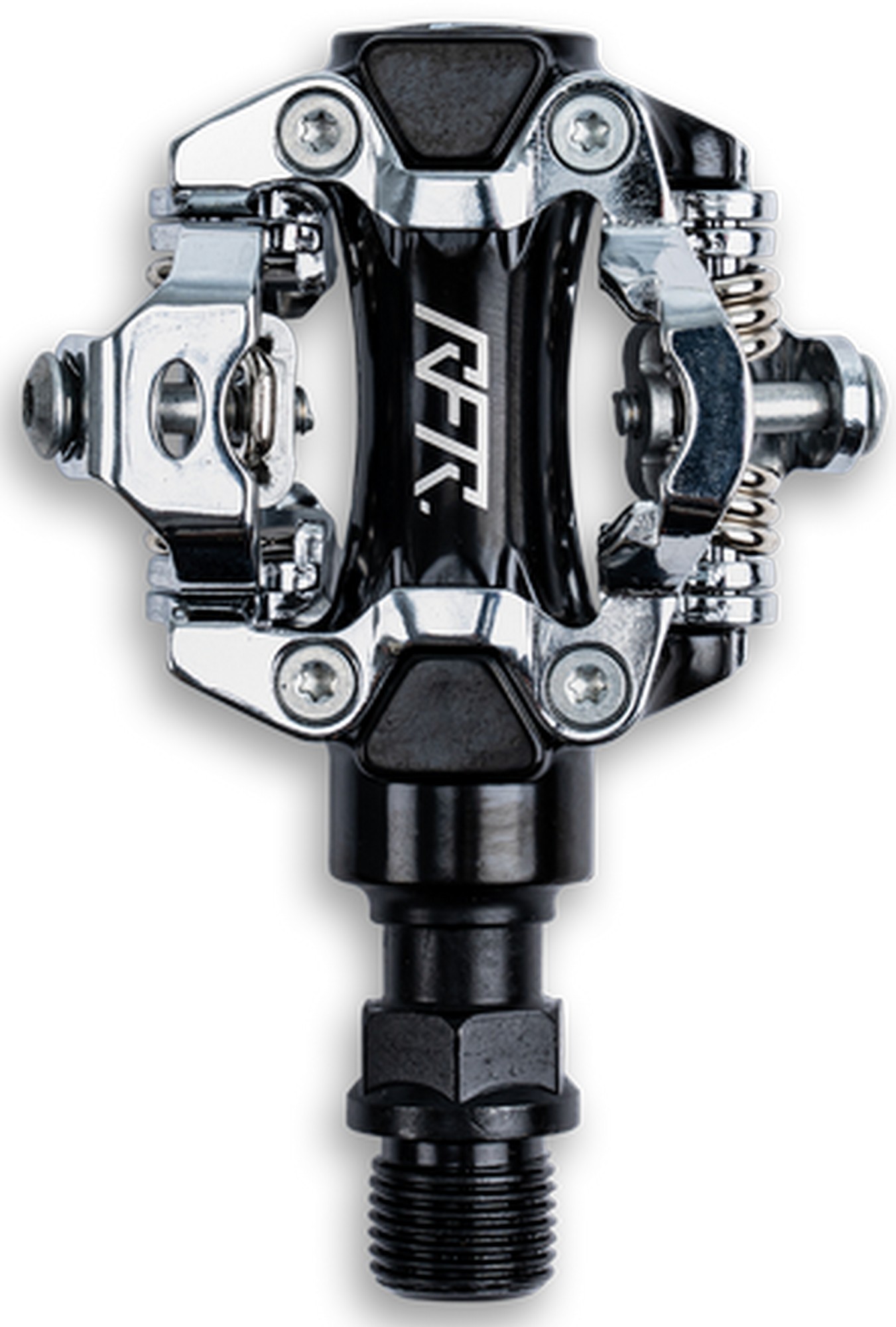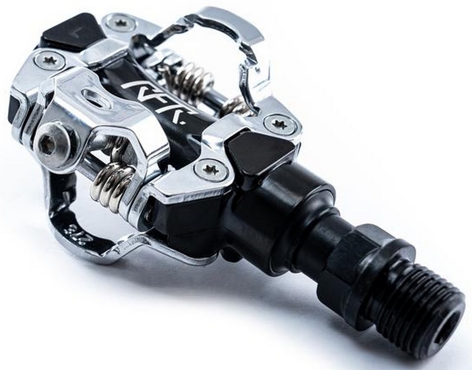 Forged clipless pedal with double-sided clip system and CNC-machined Cr-Mo axle. SPD compatible.