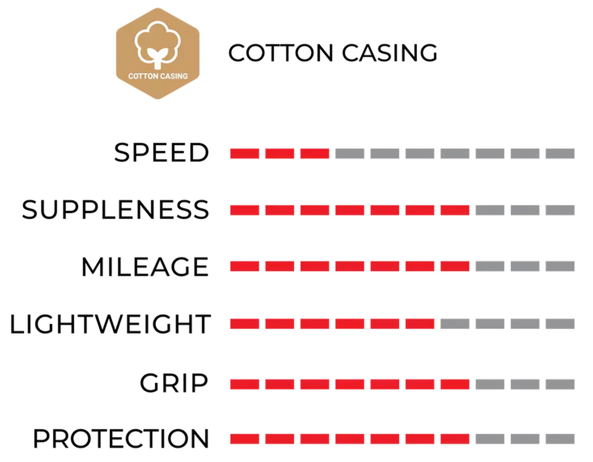 Cotton Casing: Vittoria is the first and still number one producer of cotton tires. As of today, only Vittoria best road tires are made out of cotton, a light material which makes the casing very flexible. Cotton threads have the thinnest structure in the tire casing technology, with benefits related to lightweight and flexibility. This characteristic allows to develop casings with a higher number of threads per inch, up to 320 TPI for the top-quality cotton casings. This property allows the tire to conform closer to the roads surface, providing a smoother ride, easier rolling, and better grip. In order to boost the overall strength of the casing, Vittoria uses Cotton yarn, which is a particular type of yarn made by cotton and aramid fibres combined. Vittorias Cotton casing is used for Pro Competition products, proven by multiple victories as in Tour de France, Giro dItalia, Vuelta a Espa?a, Classics, World Championships, European Championships and Olympic Games.