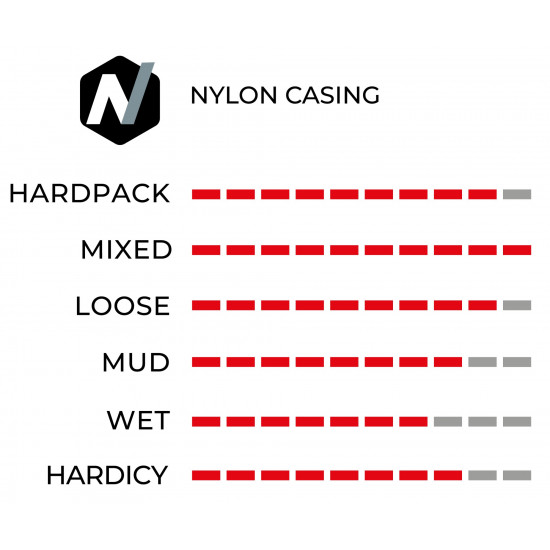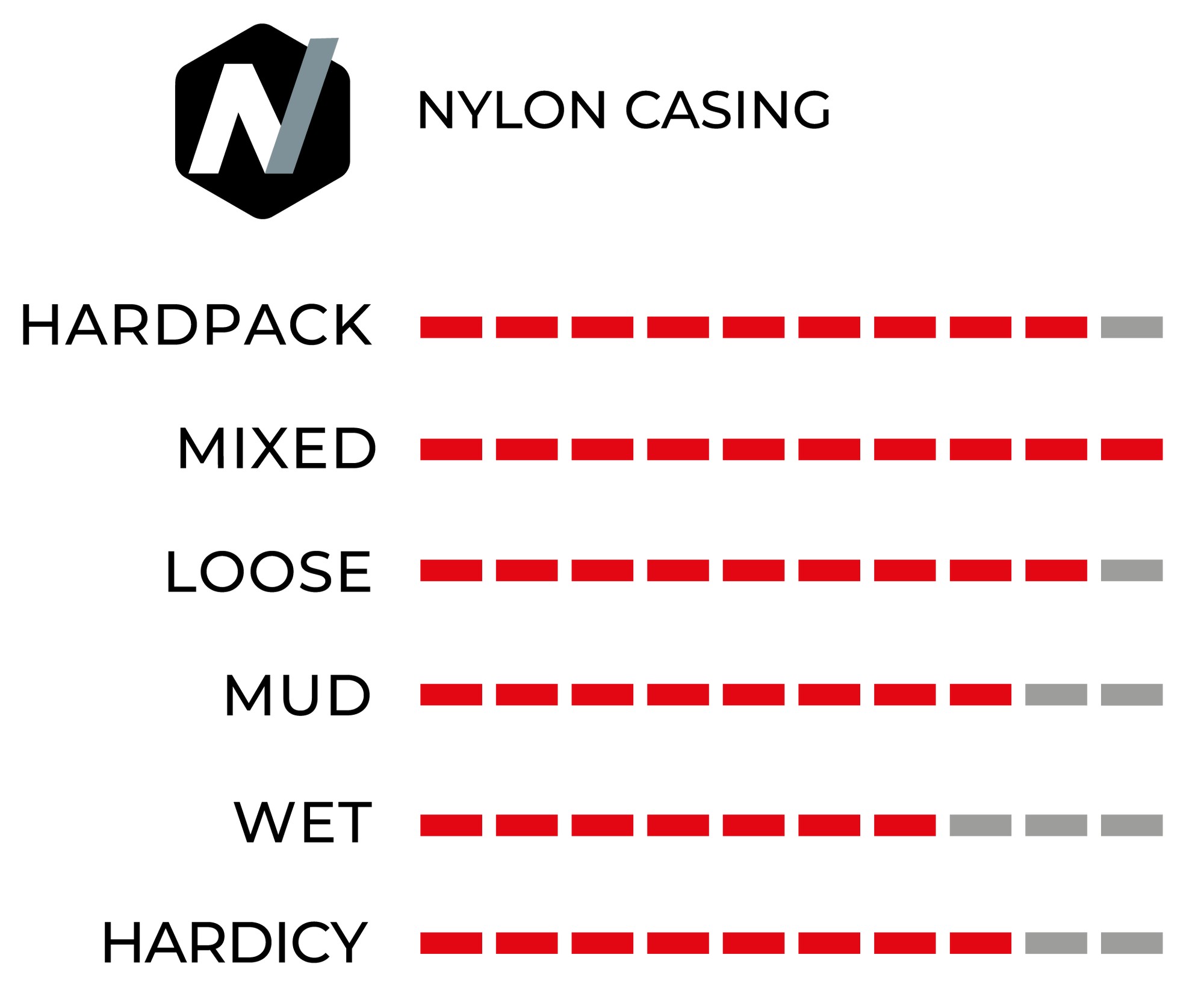 Nylon Casing: Nylon is a robust and durable artificial fiber traditionally used for strong tire casings. Nylon threads are less thin than cotton ones, so casings have a lower number of threads per inch. The advantages of nylon casings is that they are strong and durable, extending the wear life of the casing. However, because it is an artificial fiber, it is not as supple (soft/flexible) as cotton.