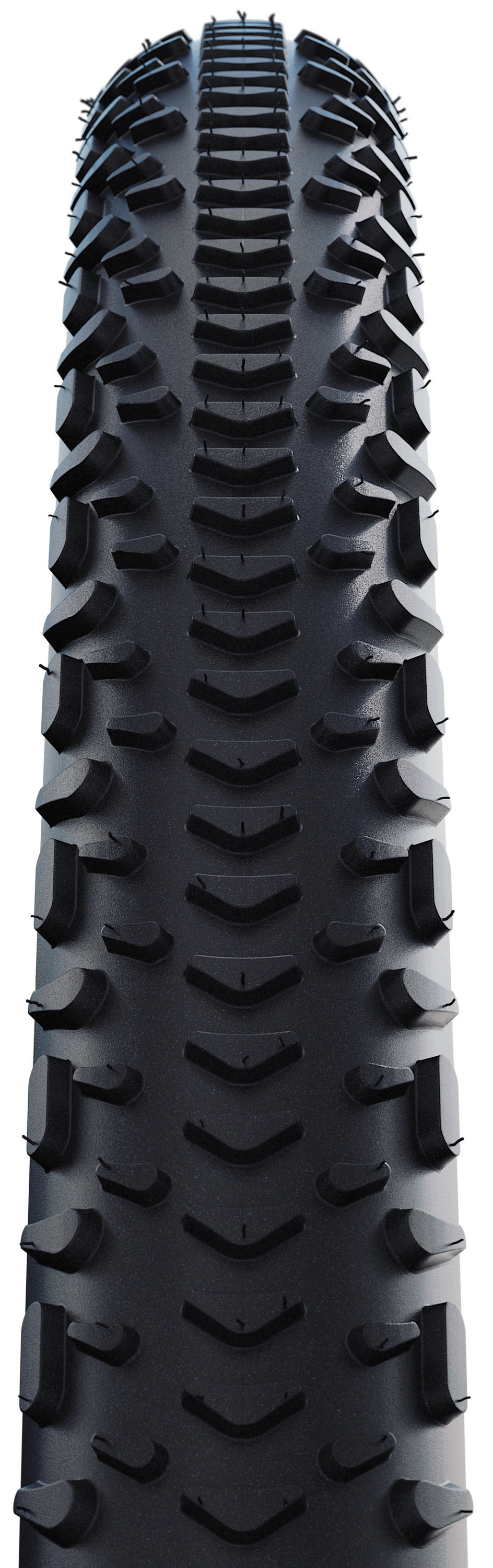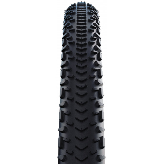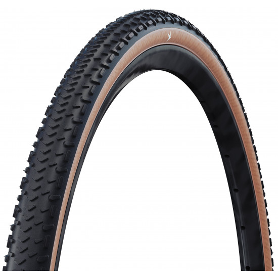 Race Performance on Any Terrain. As an expert for top performance on rough terrain, the RX model completes Schwalbe's G-One PRO portfolio. Its aggressive tread design ensures secure control on loose surfaces, rocky gravel and muddy trails, even at high speeds. While the "Boomerang" elements in the center enable smooth rolling and improved braking, the outer lugs provide more traction and the necessary lateral stabilization in fast corners and on demanding tracks. The intermediate studs in turn provide a strong grip, even under load. Thanks to its design with wide gaps, the G-One RX PRO folding tire also has self-cleaning properties, which are particularly beneficial in muddy conditions.