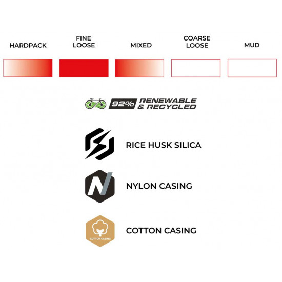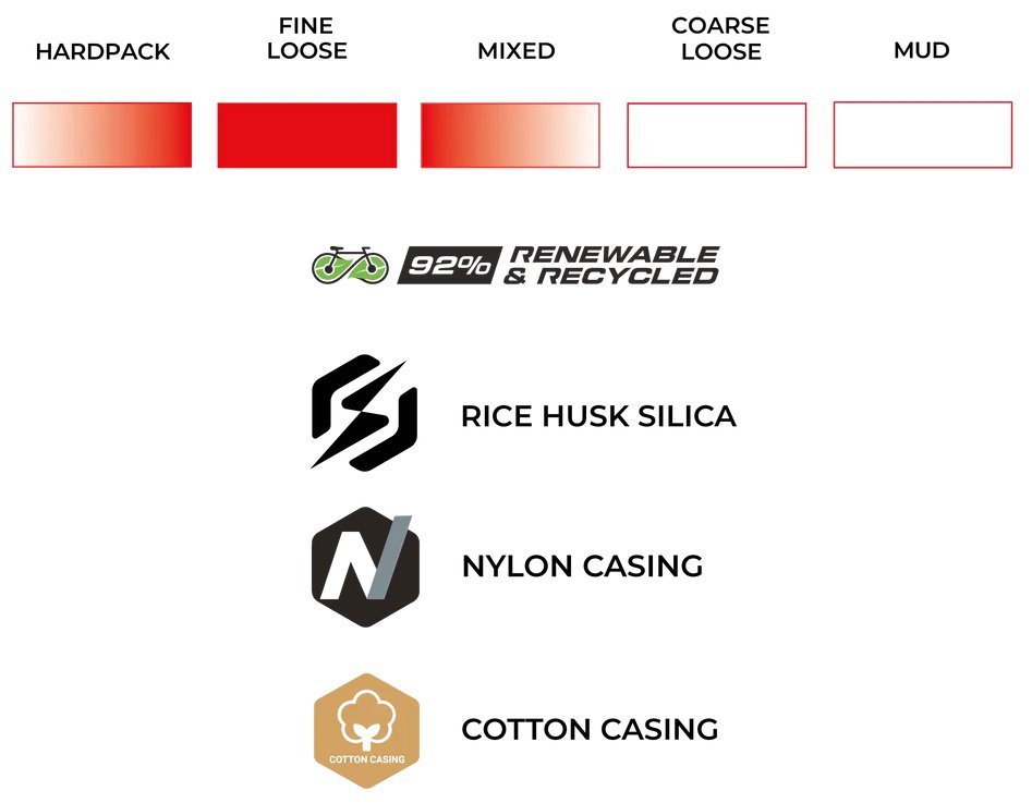 ECO RACE FORMULATION Next-generation compound blend developed specifically for competitive gravel racing, delivering exceptional speed and grip across varied terrain. Renewable and recycled ingredients include Fair-Rubber certified natural rubber, soybean oil and rice husk ash silica.
